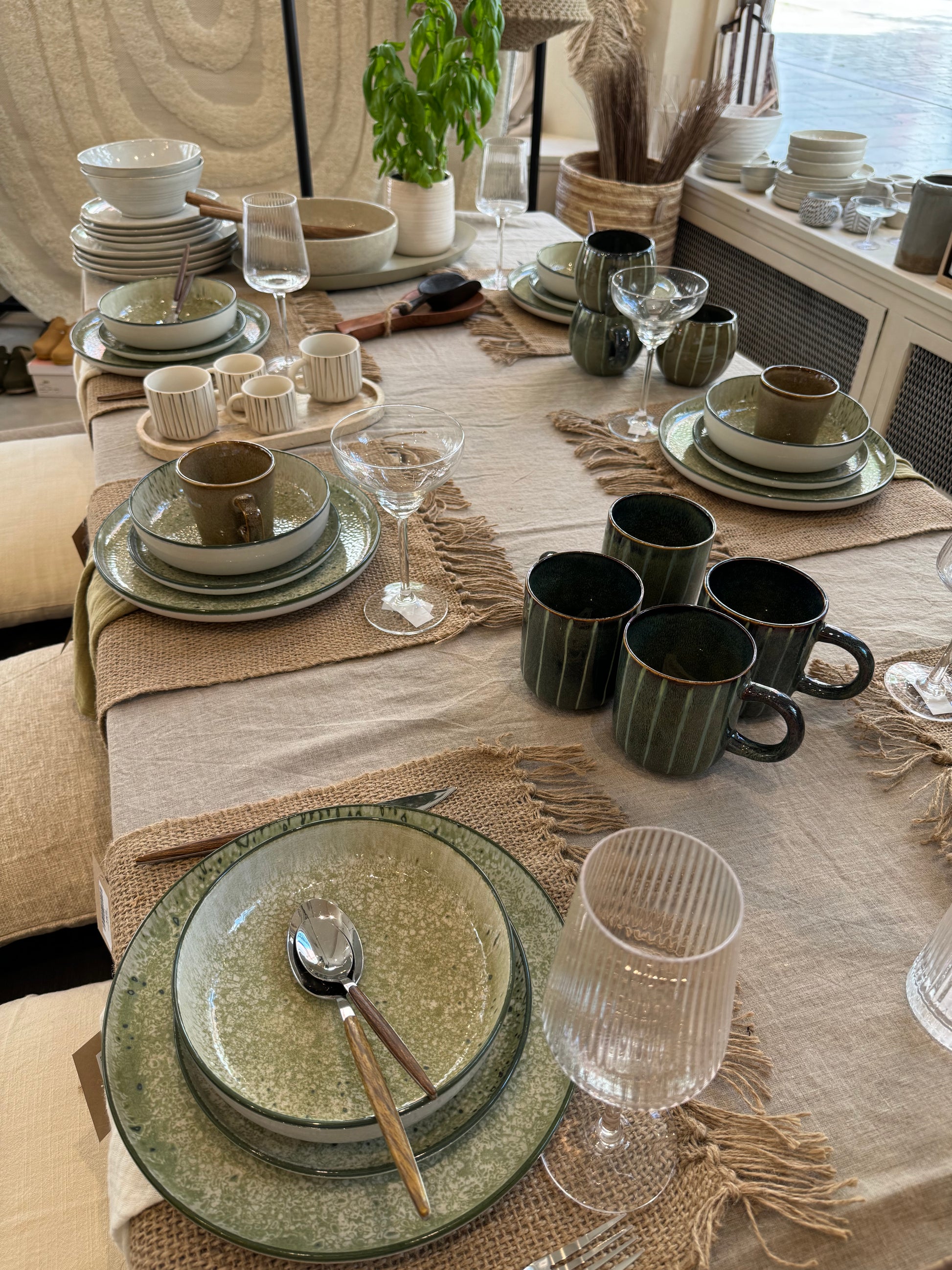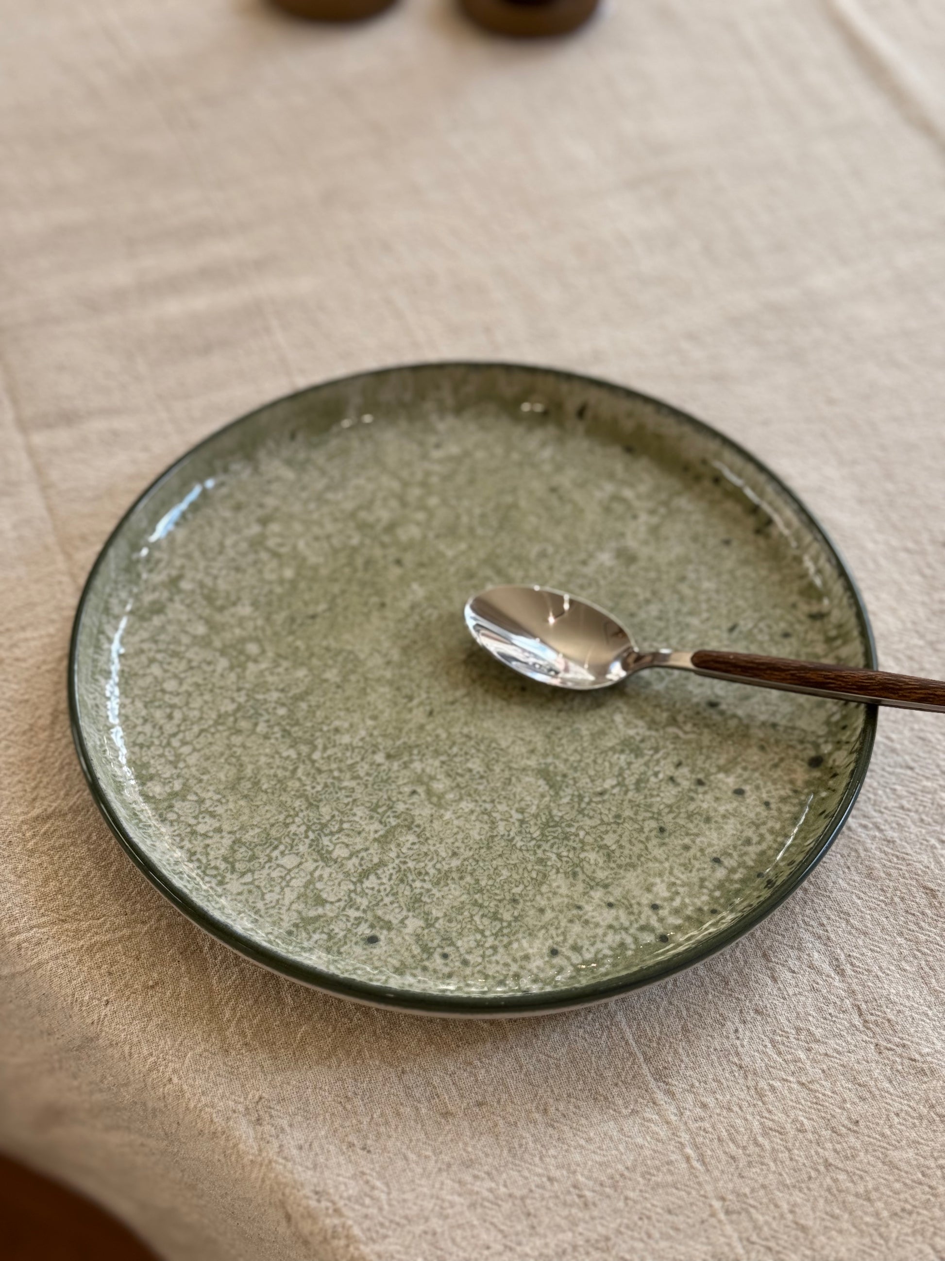 Ses lignes épurées aux extérieurs avec son vert moucheté à l'intérieur, font d'elle une assiette avec du style. À associer sans modération avec du linge de table sobre
