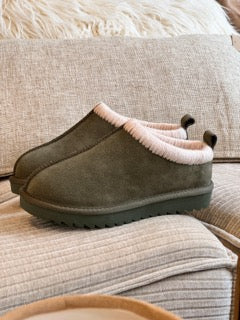 Boots / chaussons fourrés en laine à l'intérieur, coloris kaki surpiqures écrues. Idéales pour traîner à la maison ou adopter un look cosy à l'extérieur.