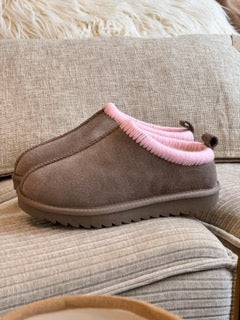 Boots / chaussons fourrés en laine à l'intérieur, coloris taupe surpiqures roses. Idéales pour traîner à la maison ou adopter un look cosy à l'extérieur.