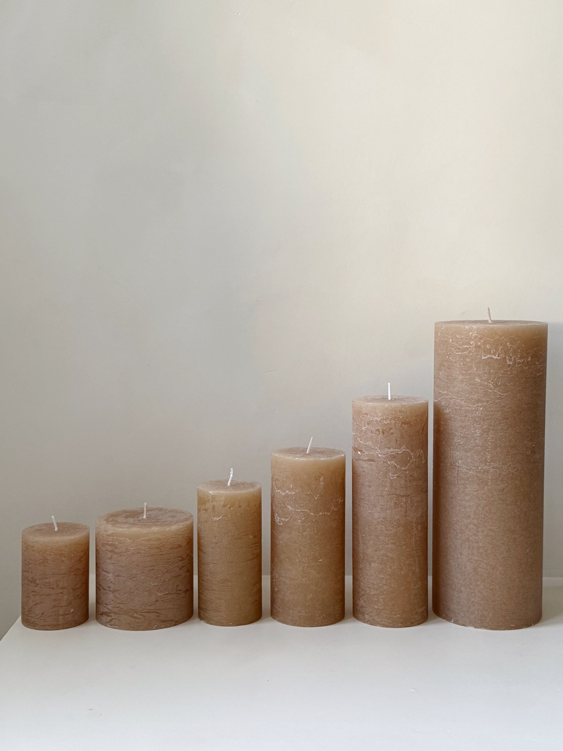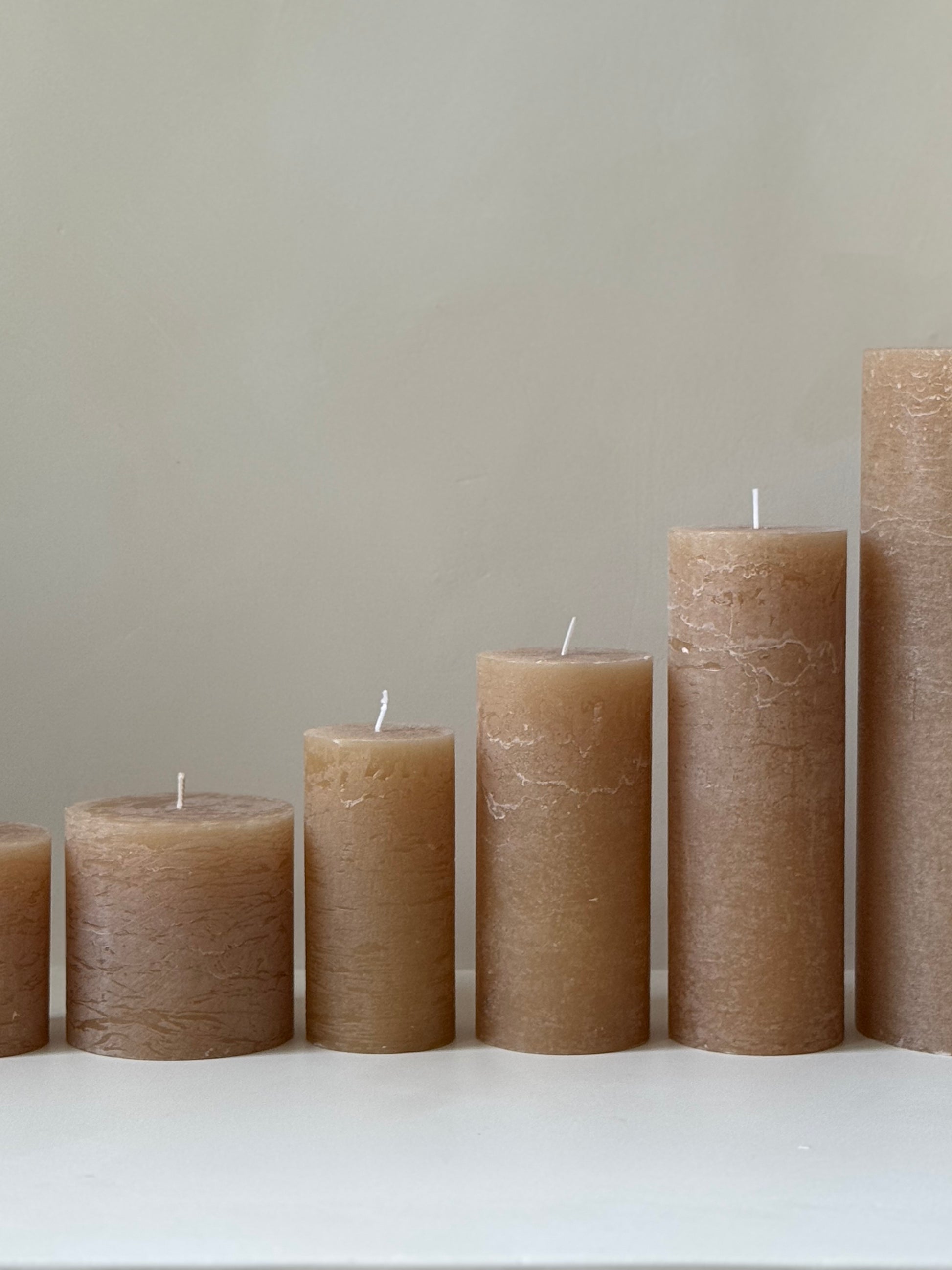 Bougie à poser coloris cappuccino. Se consument vers l'intérieur, la bougie ne coule pas vers l'extérieur.