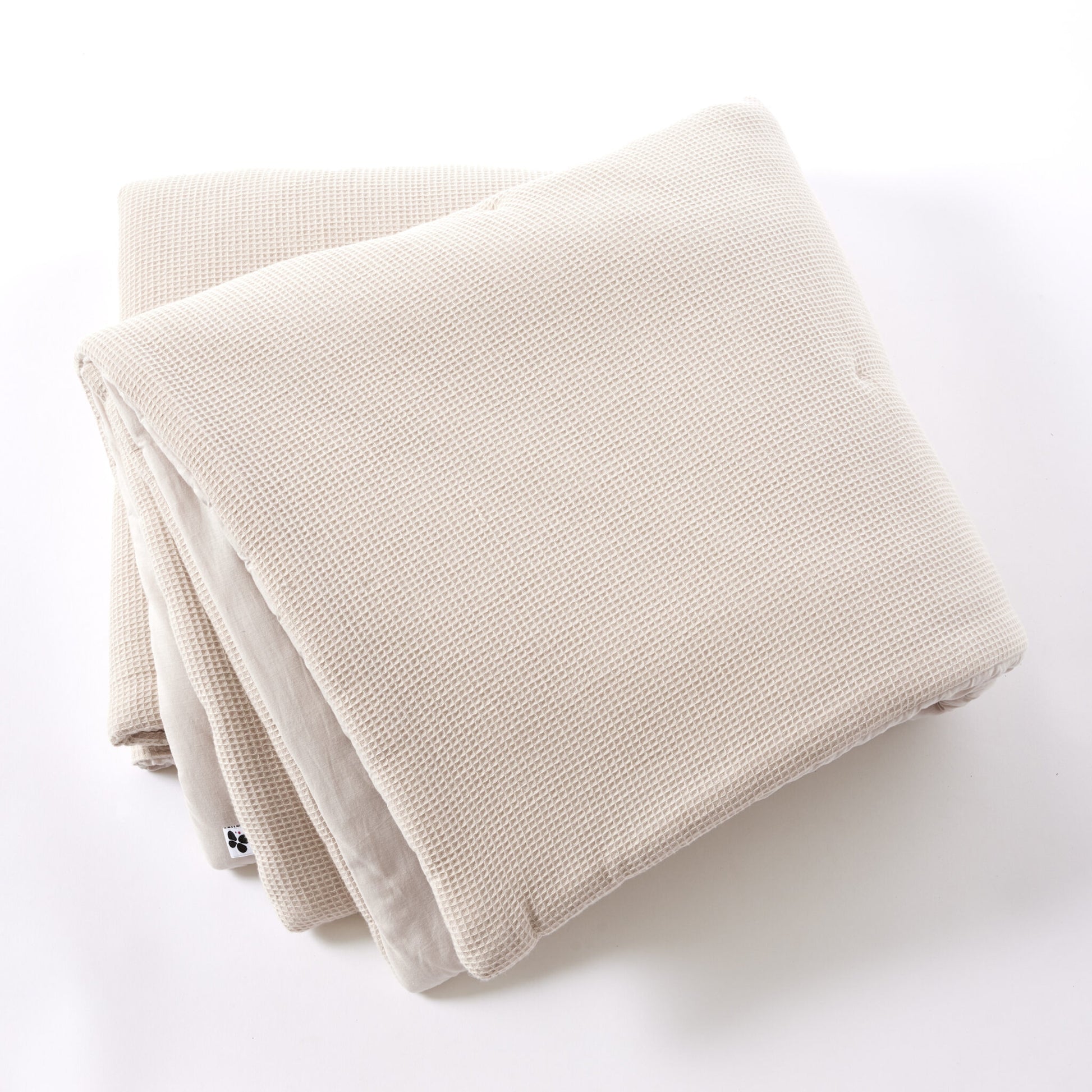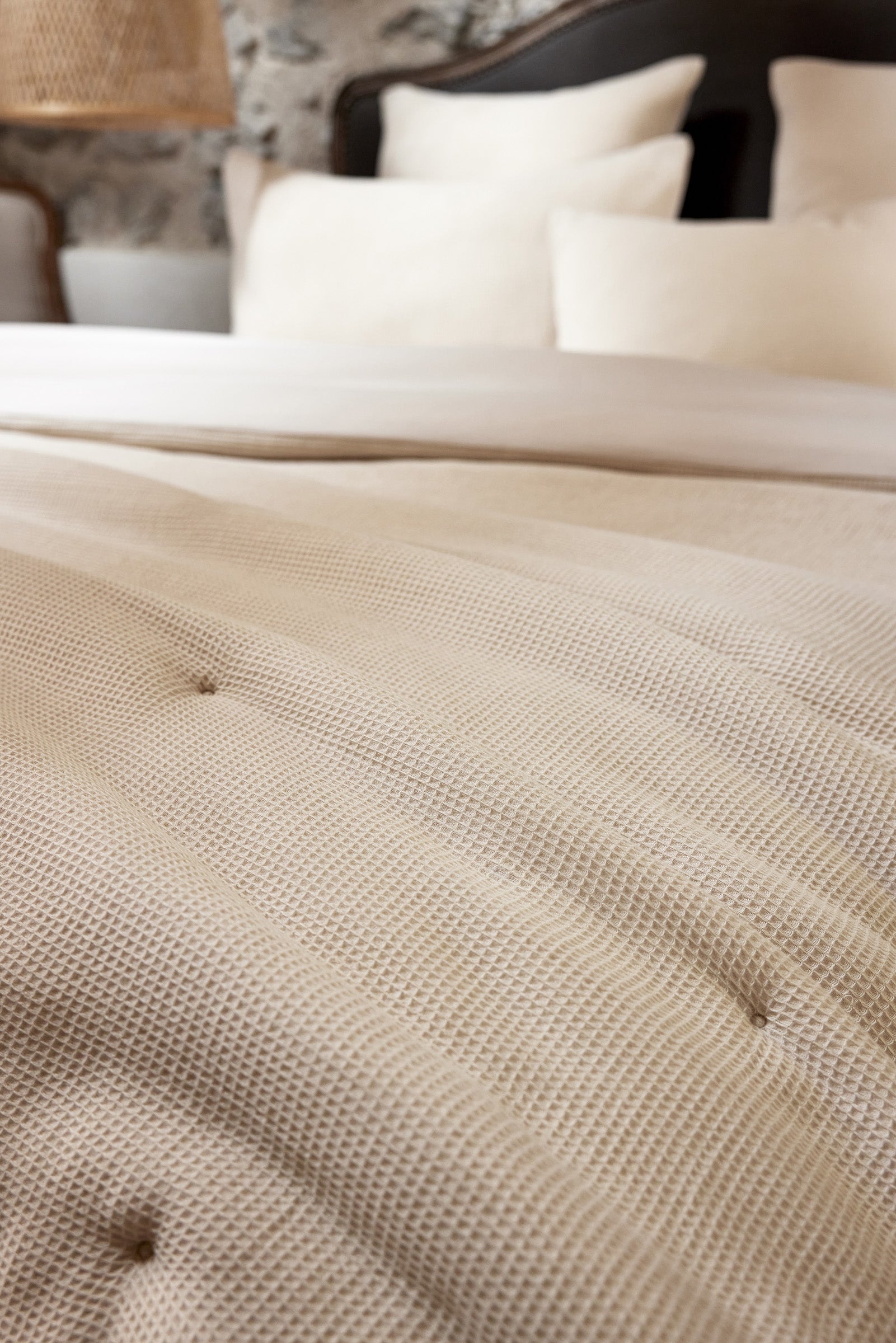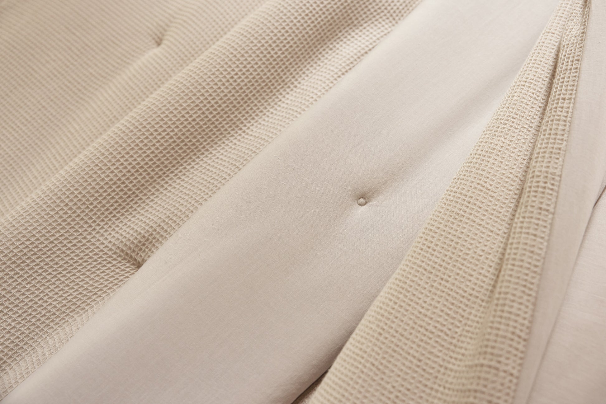 Bout de lit coloris pampa, effet "capitonné". Le verso est en mini nid d'abeille et le verso en coton lavé. Rembourré à l'intérieur, ce qui lui donne une épaisseur suffisante pour créer une ambiance cocooning. On soigne sa déco jusqu'au bout avec le bout de lit.
