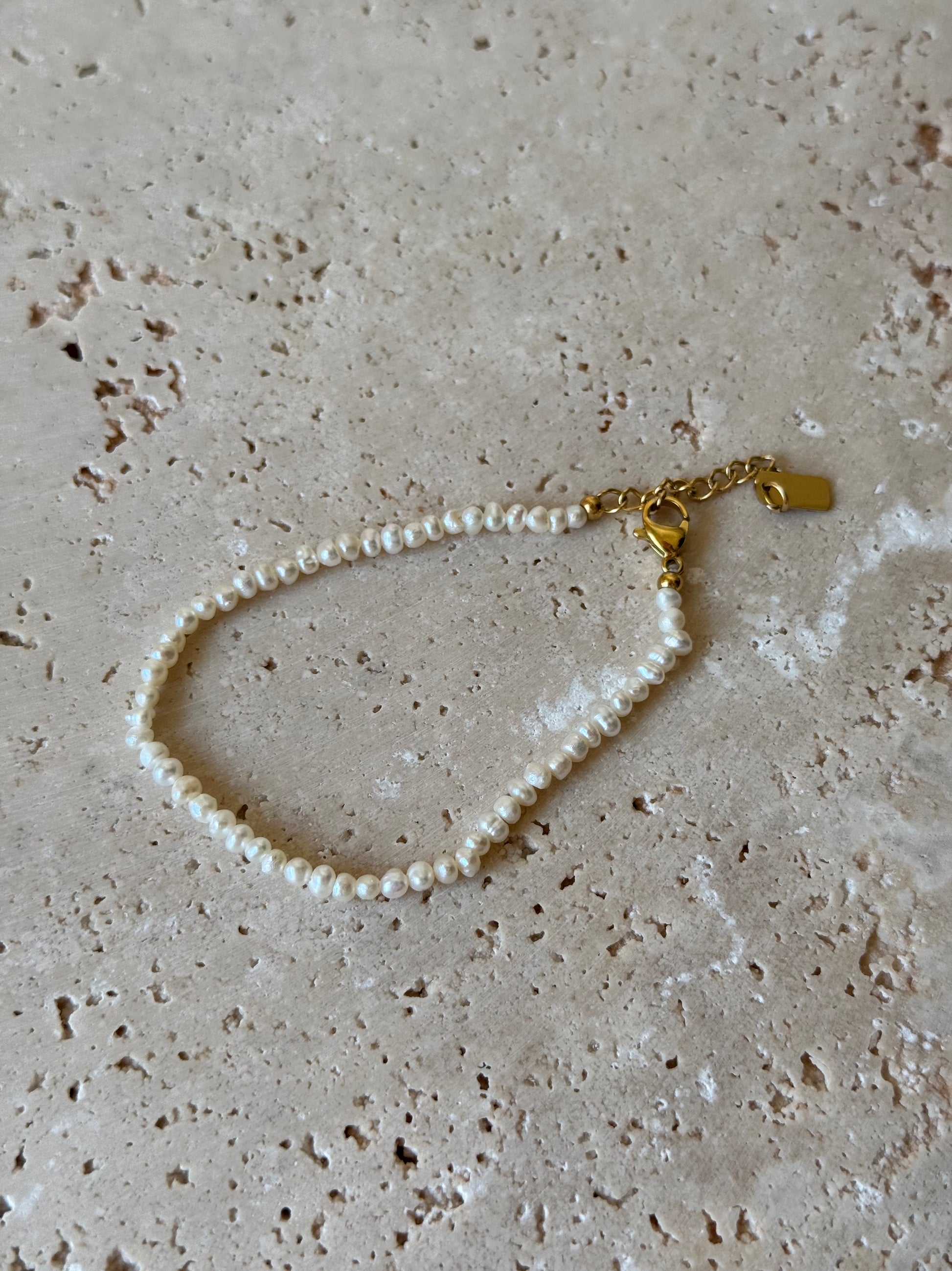 Bracelet muni de petites perles d'eau douce. Réglable. Très élégant et lumineux, à porter seul ou en accumulation.