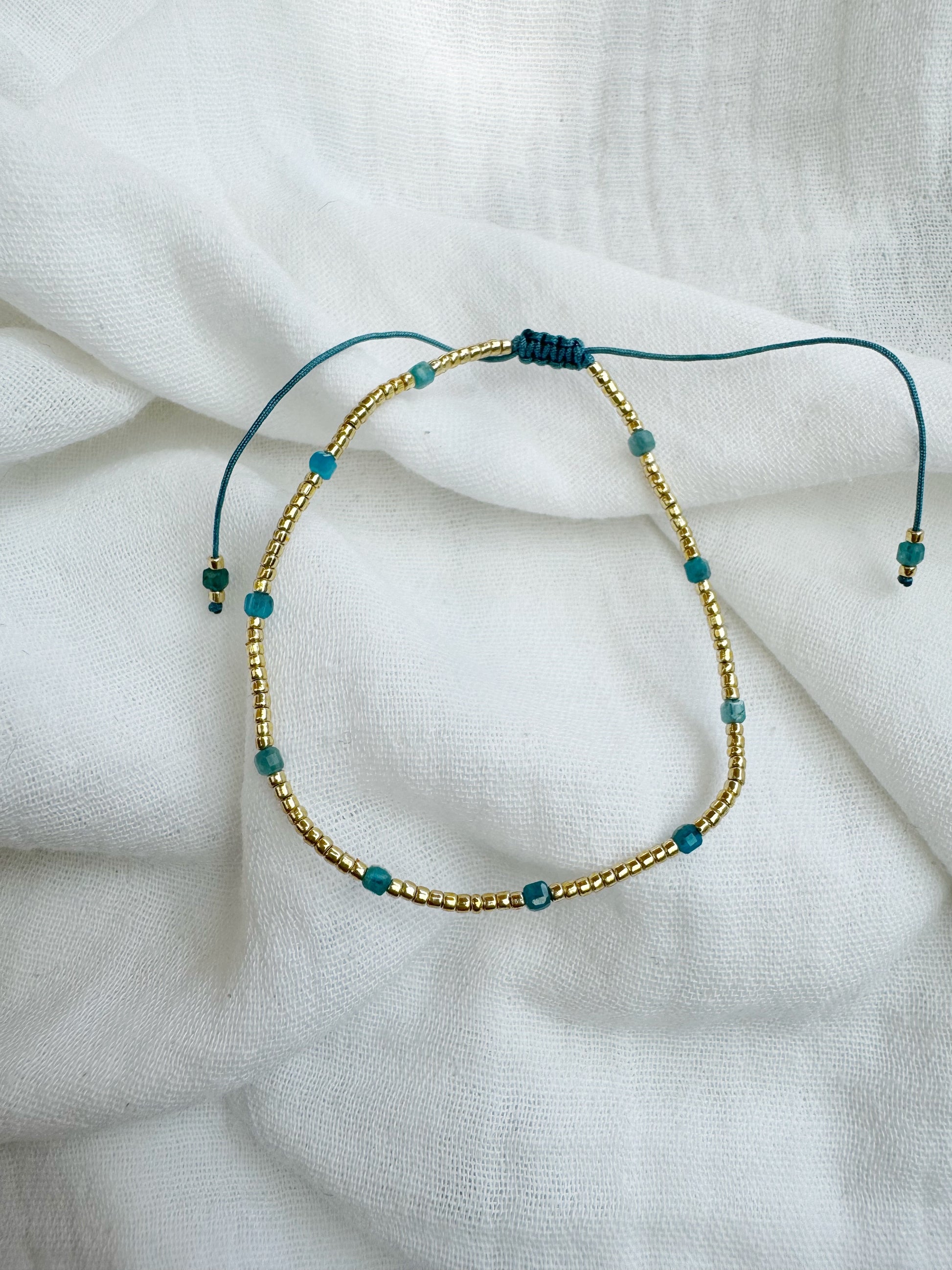 Bracelet muni des perles miyuki dorées et des perles carrées bleues. Ferme par cordons à coulisses. À porter seul ou en accumulation