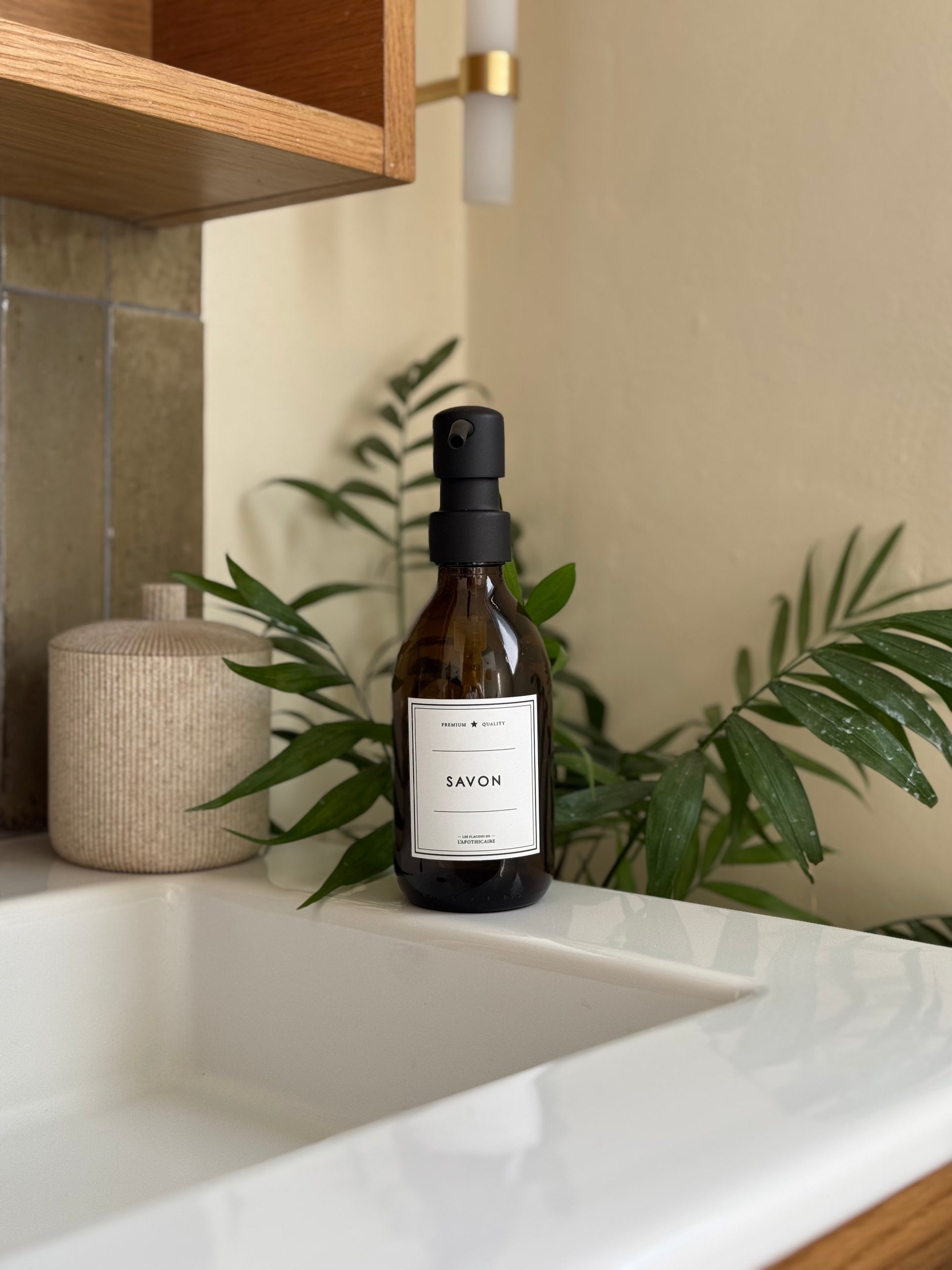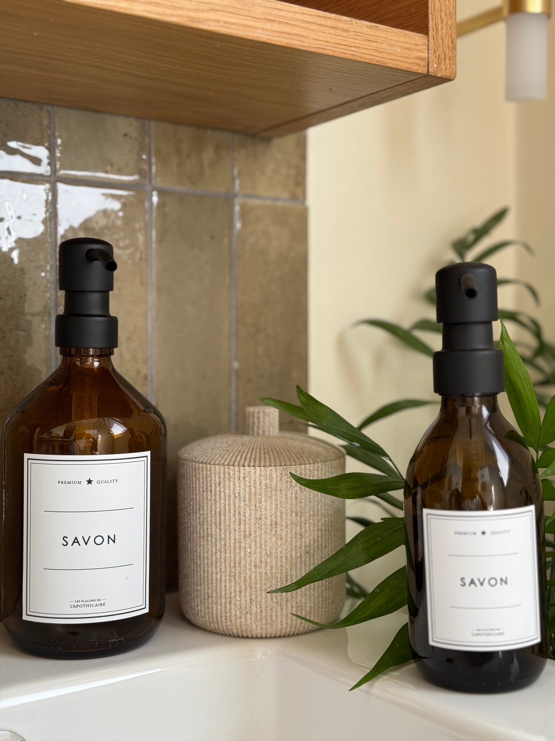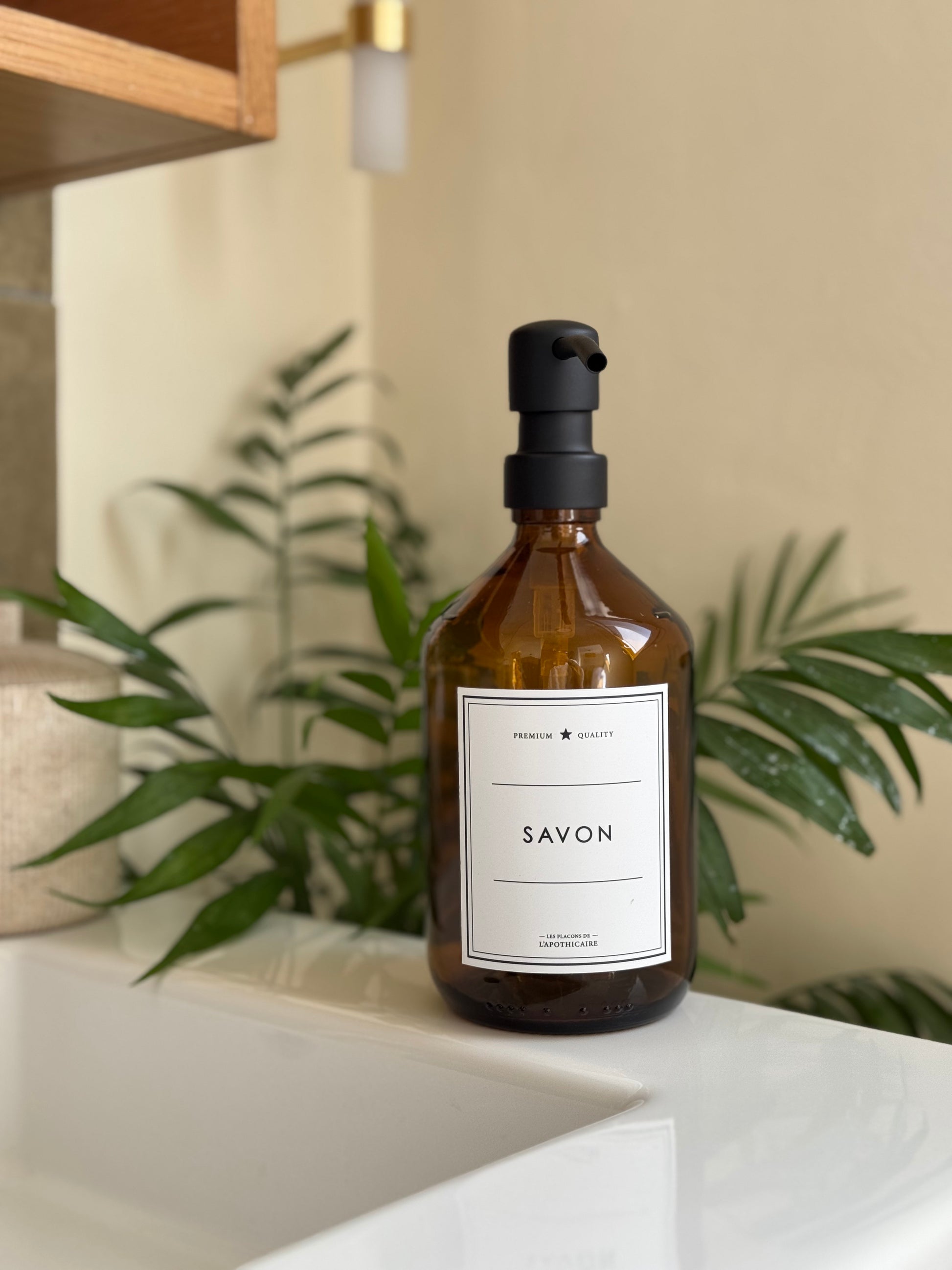 On craque pour ces flacons qui nous permettent de pousser la déco dans les moindres détails ;) Son flacon en verre ambré nous permet de garder une uniformité visuelle (car nous ne verrons pas la couleur du liquide versé dedans ;) et il préservera les liquides sensibles à la lumière ;)