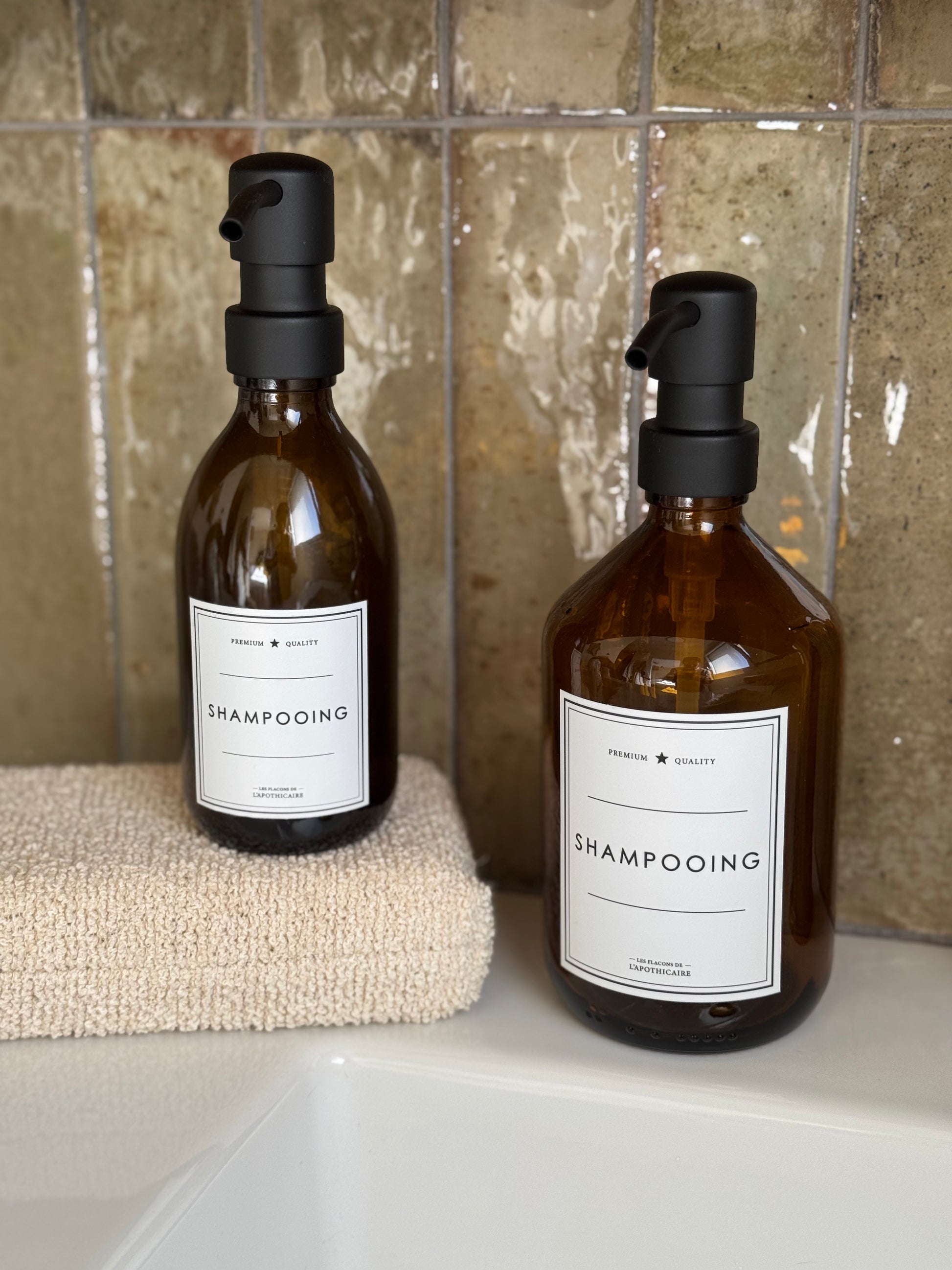 Flacon en verre ambré, étiquette résistance aux éclaboussures, pompe noire.