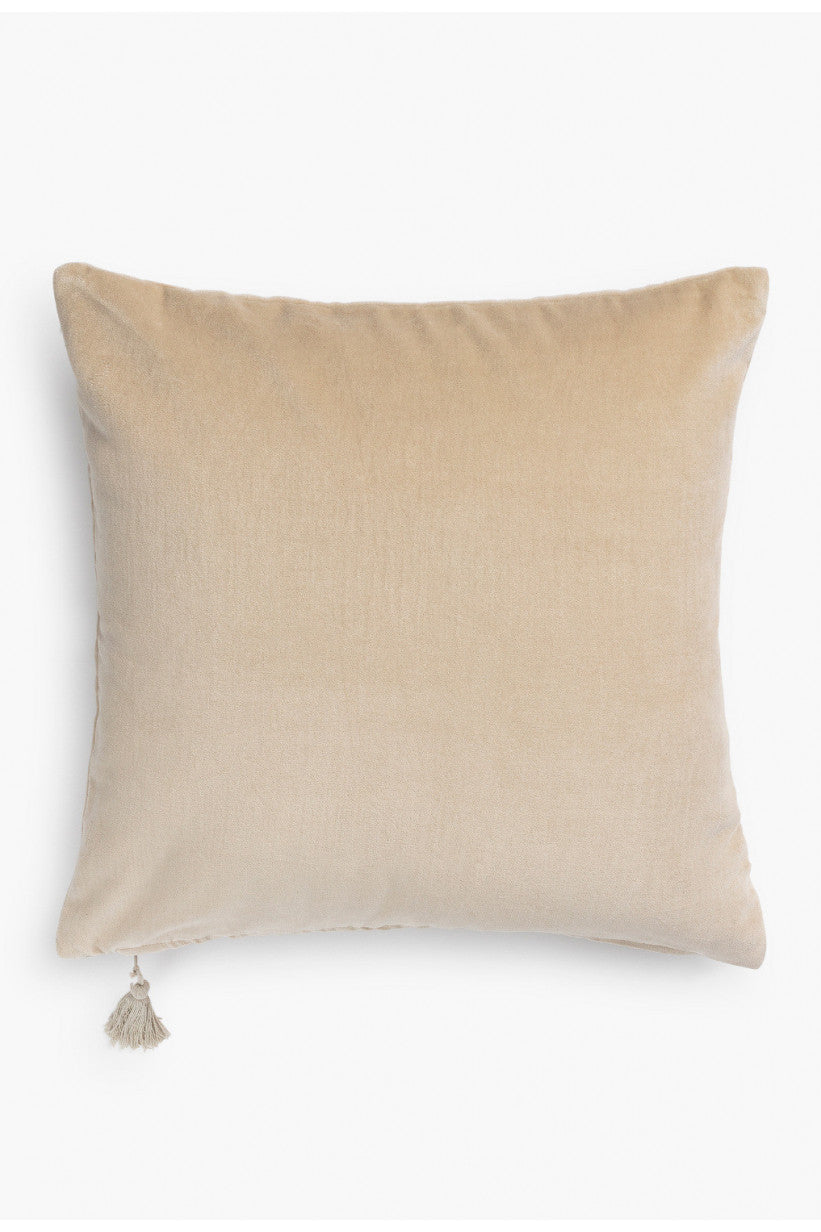 Housse de coussin 45 x 45 cm beige avec une nuance de vert. À Accumuler dans votre canapé ou en décoration dans votre chambre. Ferme par fermeture éclair (munie d'un pompon) sur un des angles de la housse, peut-être utilisée recto verso.