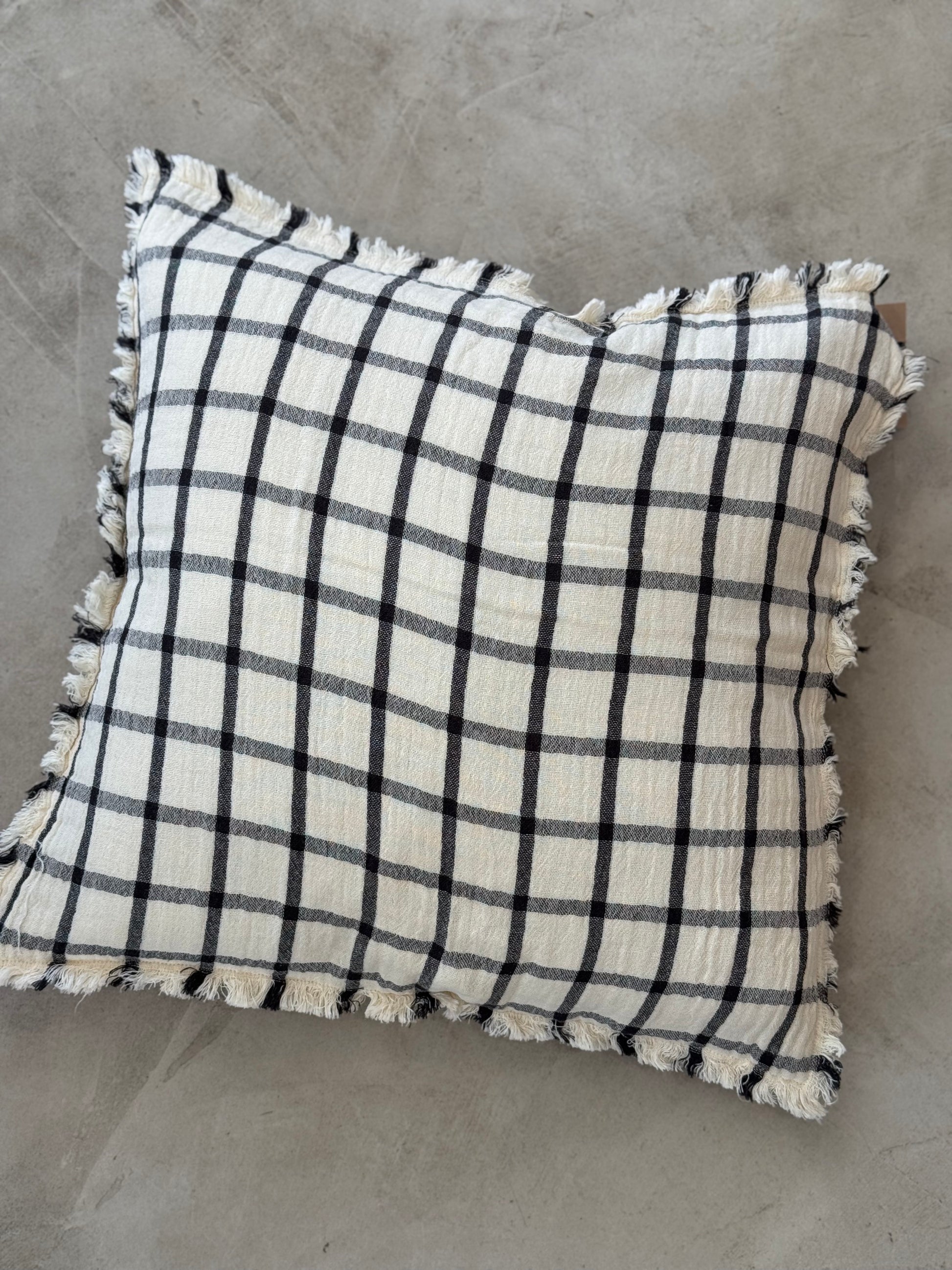 Housse de coussin en gaze de coton écrue à carreaux noirs. Franges aux 4 extrémités de la housse. Fermeture éclaire à l'arrière de la housse, dissimulée par un rabas.