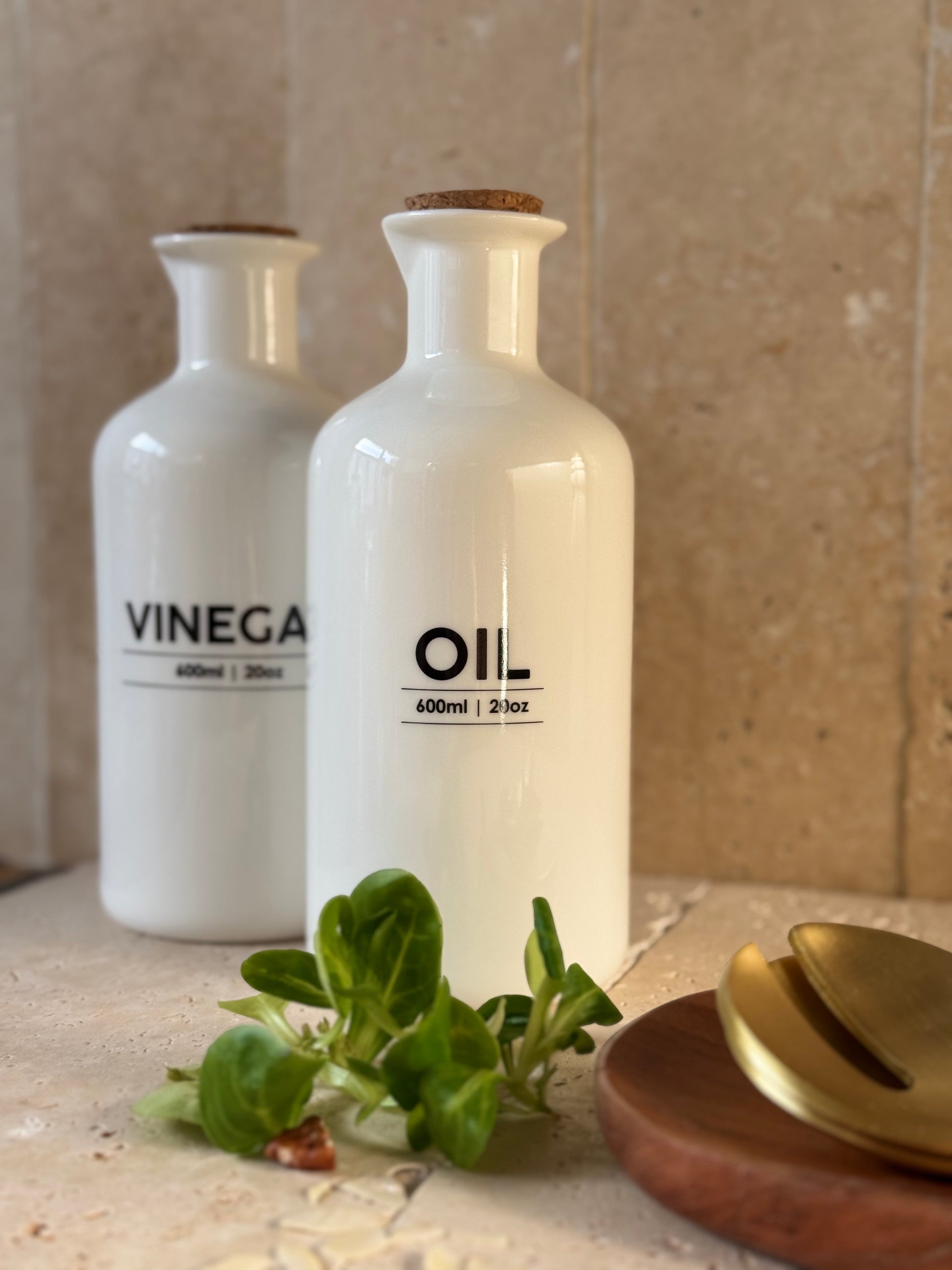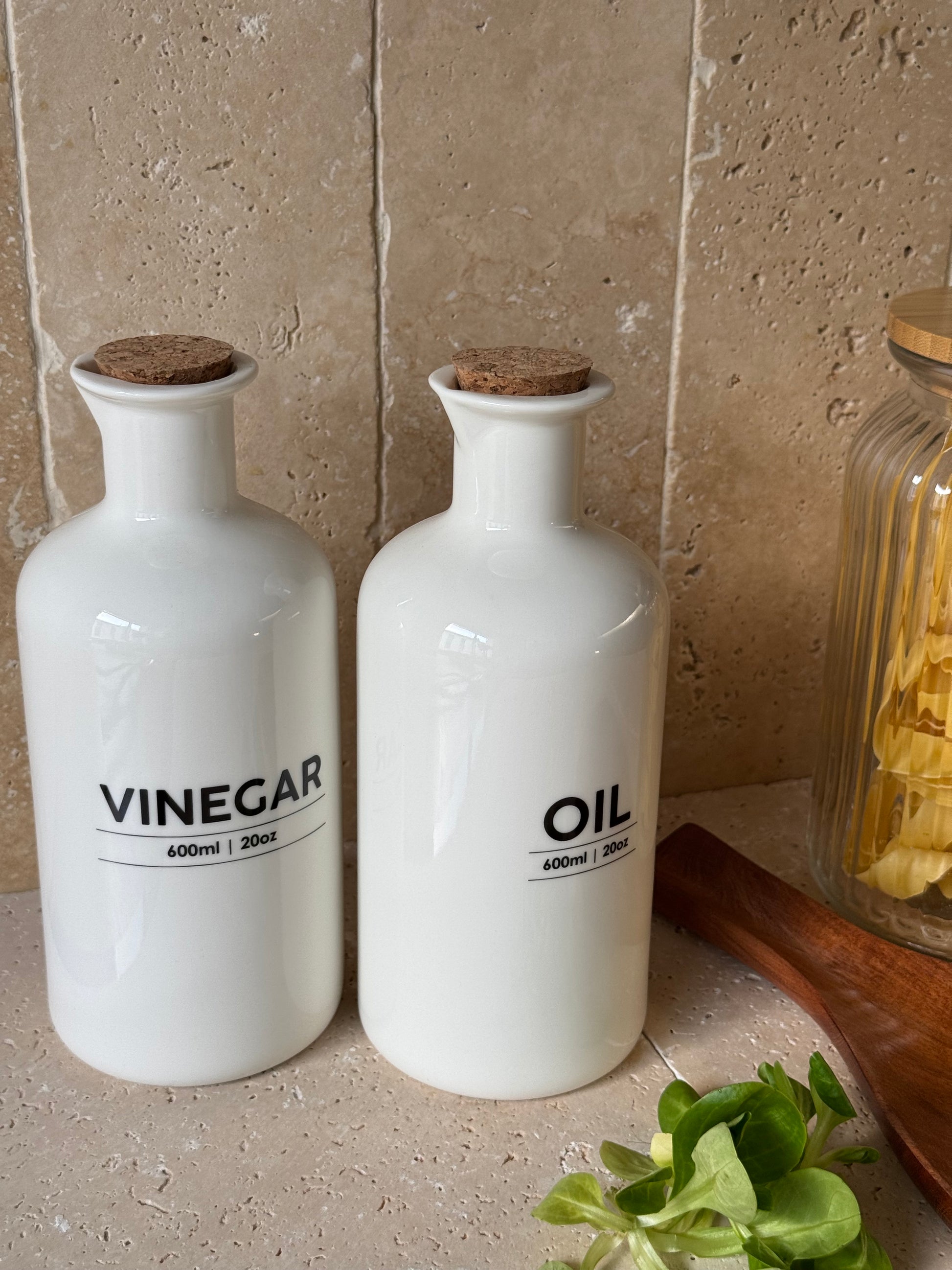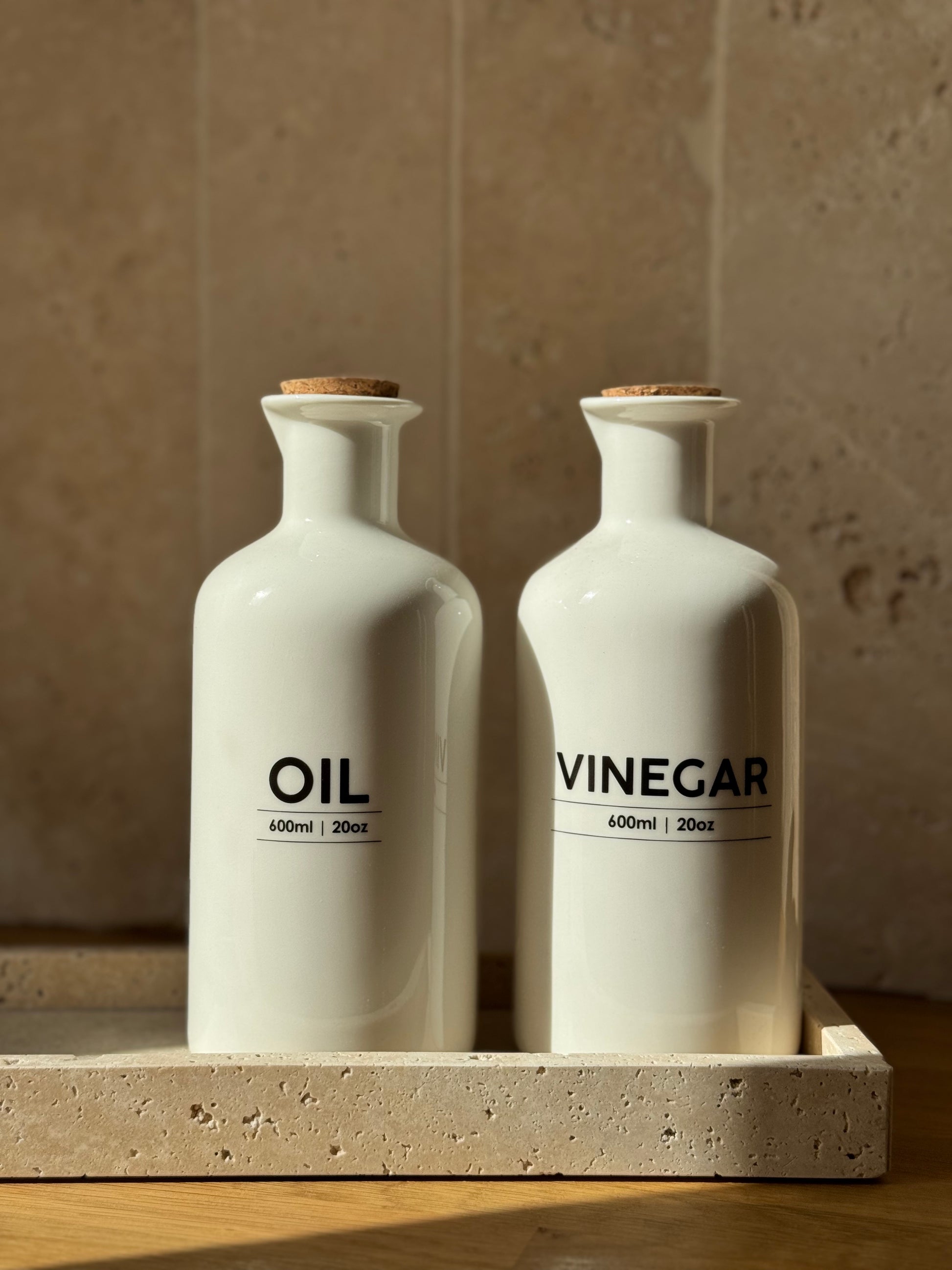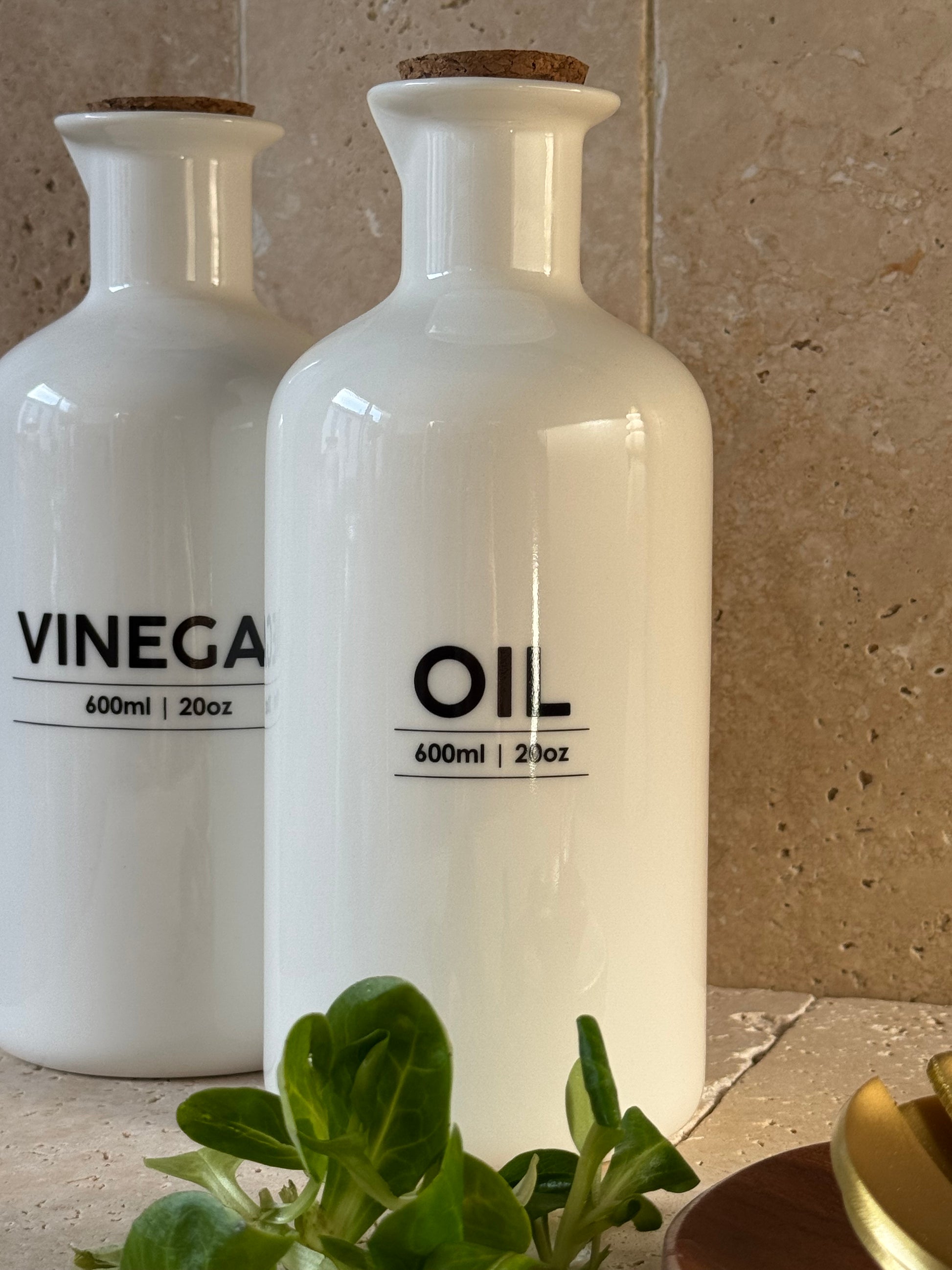 Set d'huilier et vinaigrier en grès blanc, inscriptions noires et bouchons liège. Chaque bouteille est taillée un bec verseur. Chaque bouteille peut contenir 600 ml.