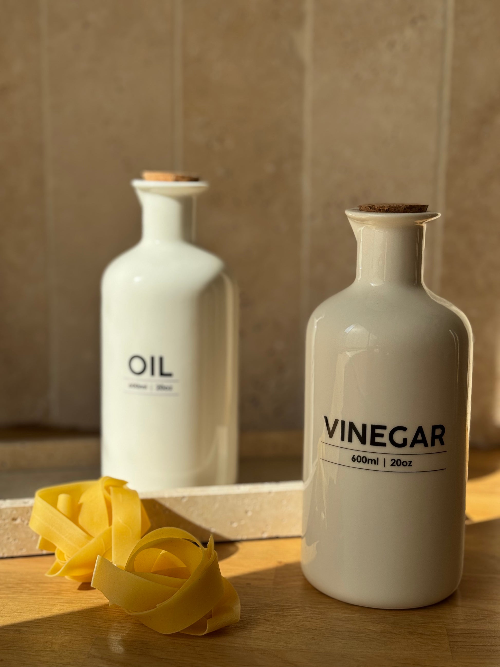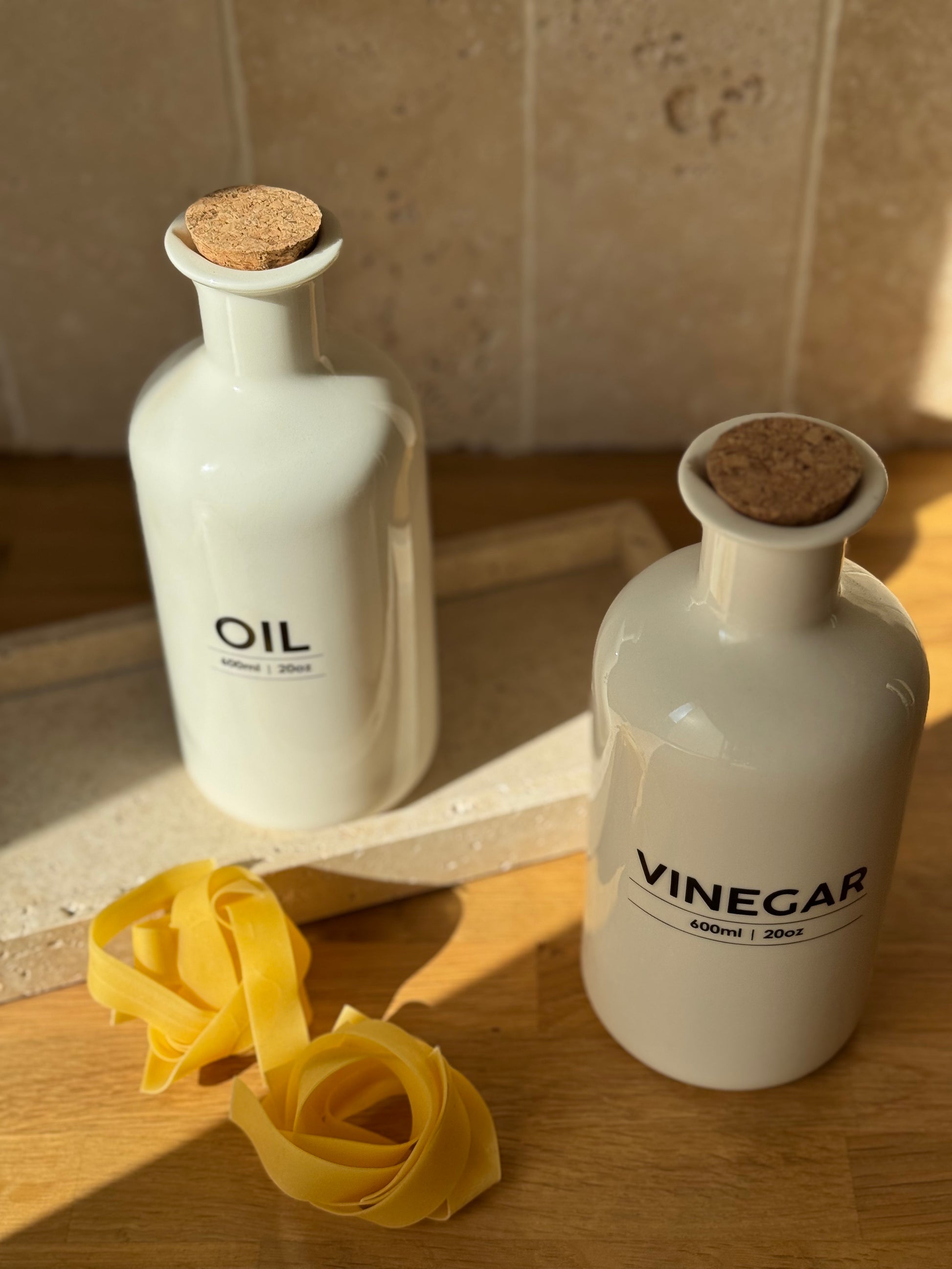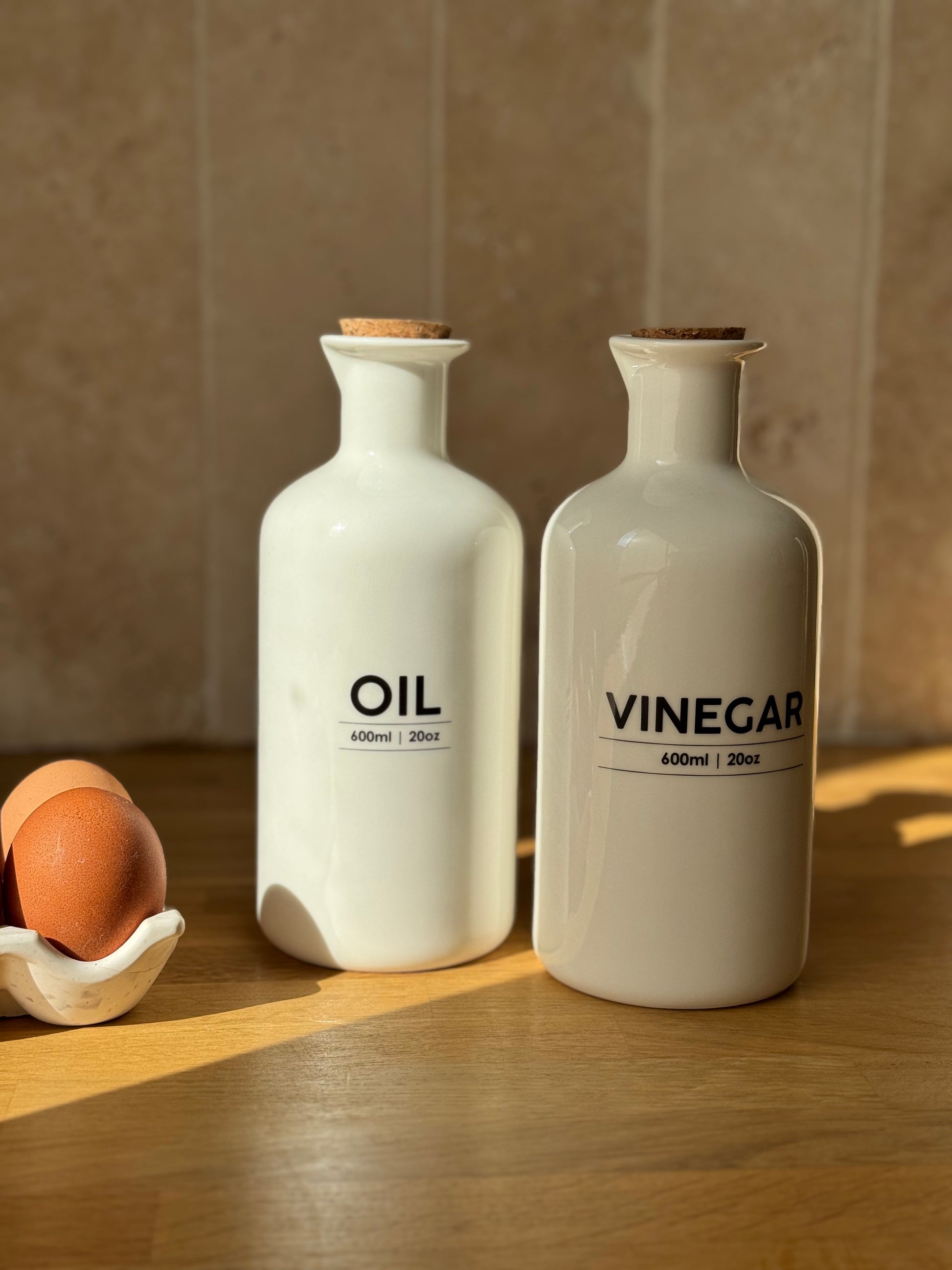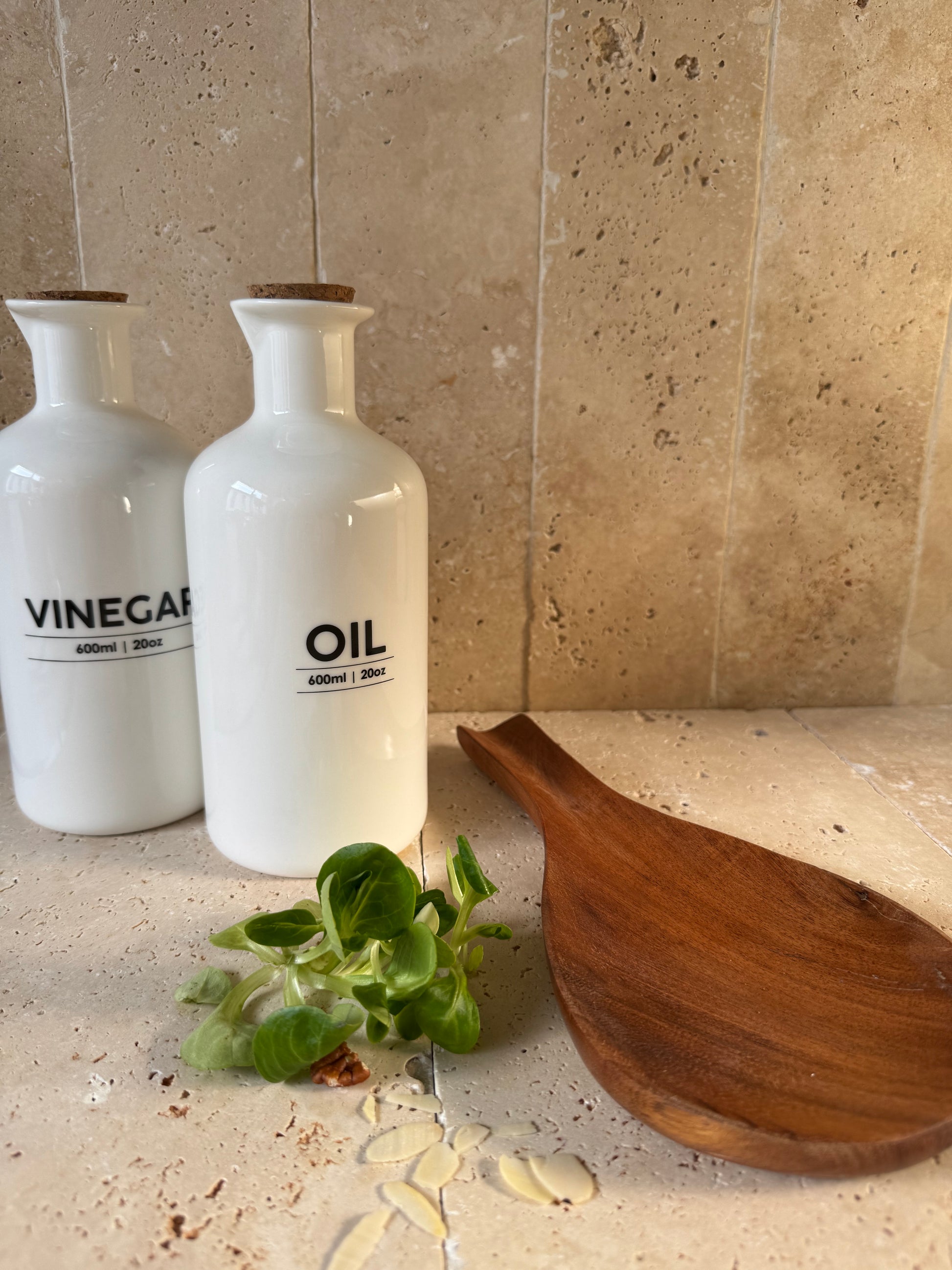 Set d'huilier et vinaigrier en grès blanc, inscriptions noires et bouchons liège. Chaque bouteille est taillée un bec verseur. Chaque bouteille peut contenir 600 ml.