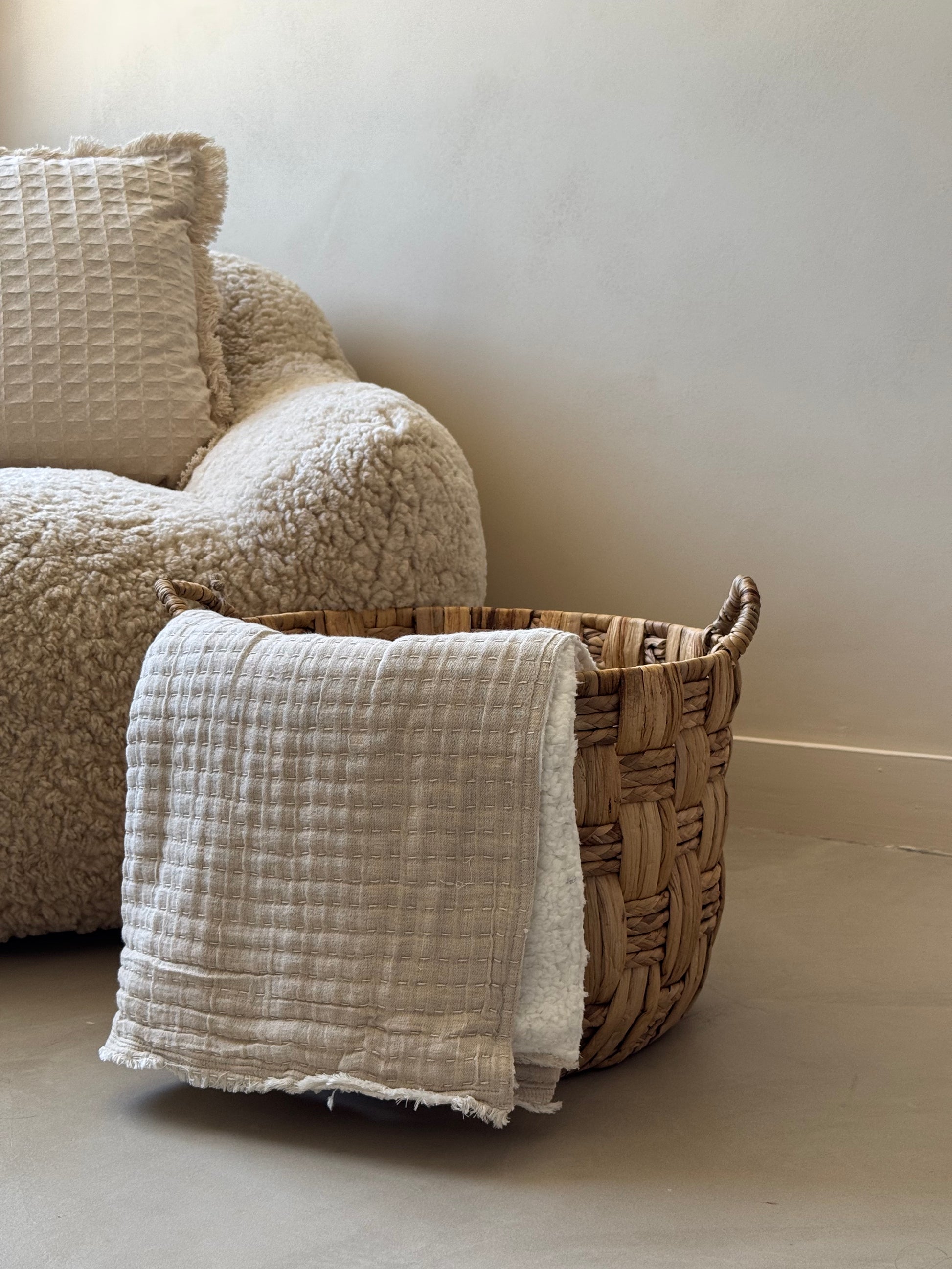 Plaid beige en coton, avec surpiqures tons sur tons. On adore son élégance, il sera à la fois beau ET chaud pour les soirées d'hiver