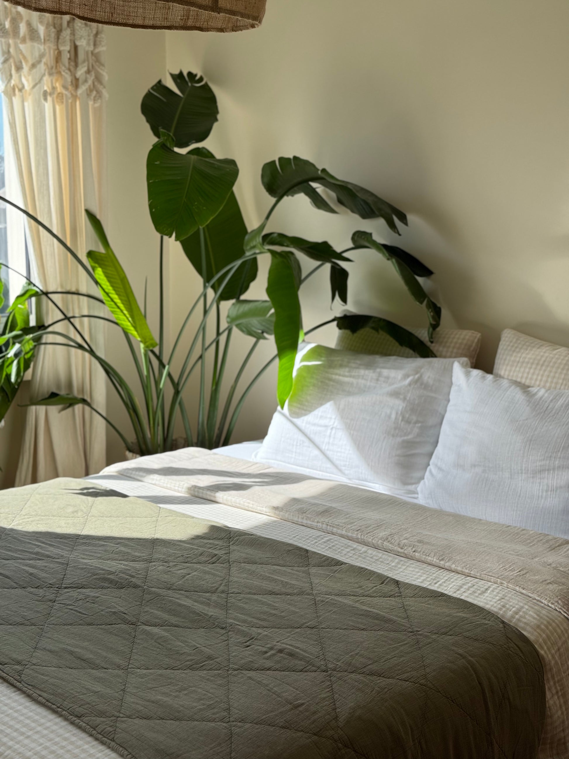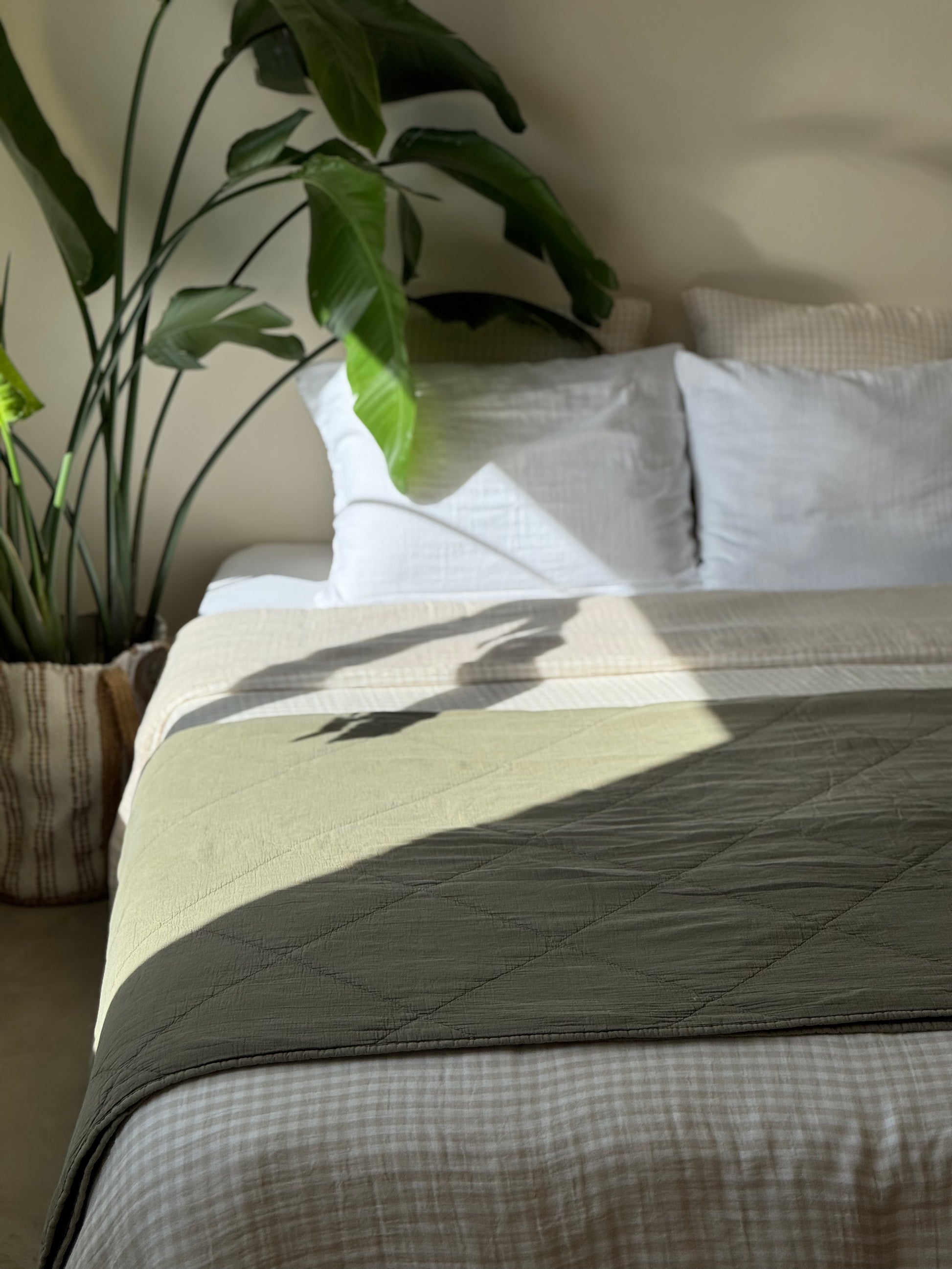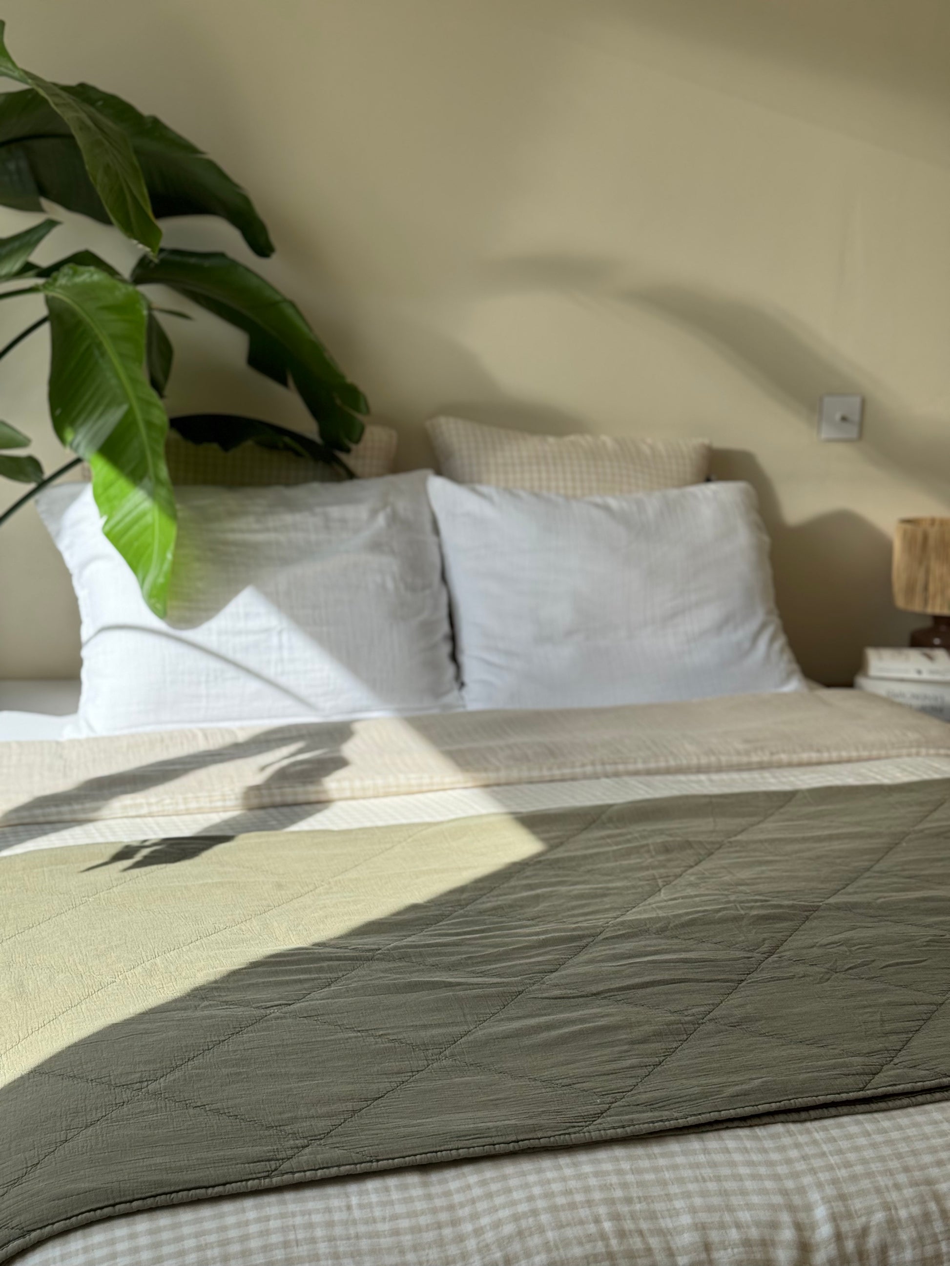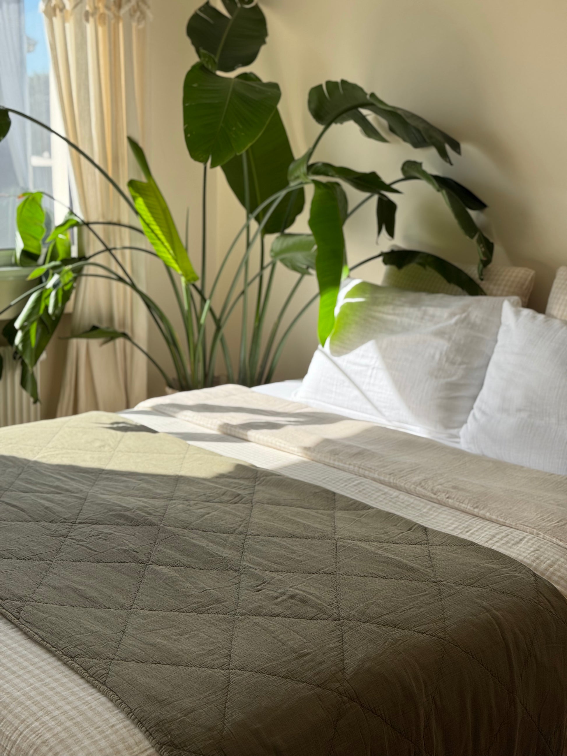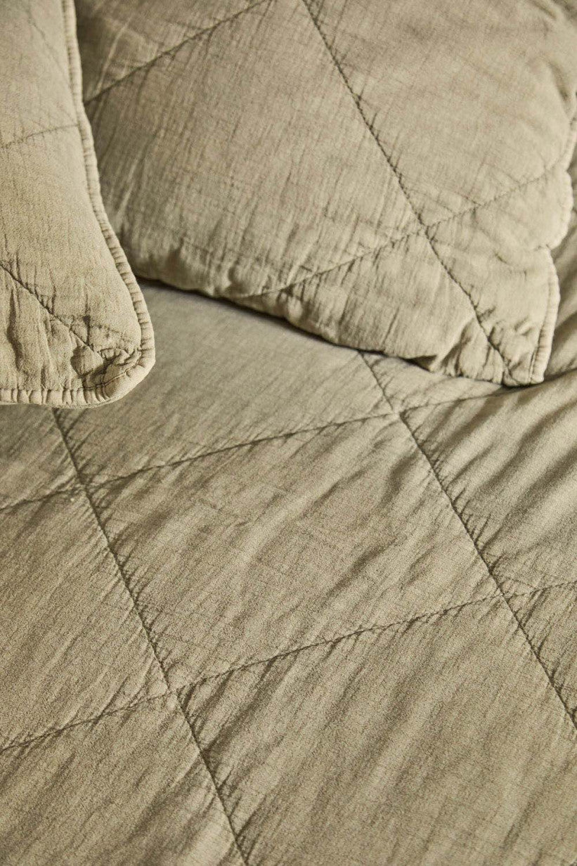 Jeté / plaid en gaze de coton matelassé vert. Sa taille le rend polyvalent, il peut-être utilisé en plaid pour le canapé, ou en jeté sur le lit pour une décoration bien finie. Cette matière ne se repasse pas vous n'aurez donc pas cette "corvée" à accomplir pour rendre votre intérieur stylé