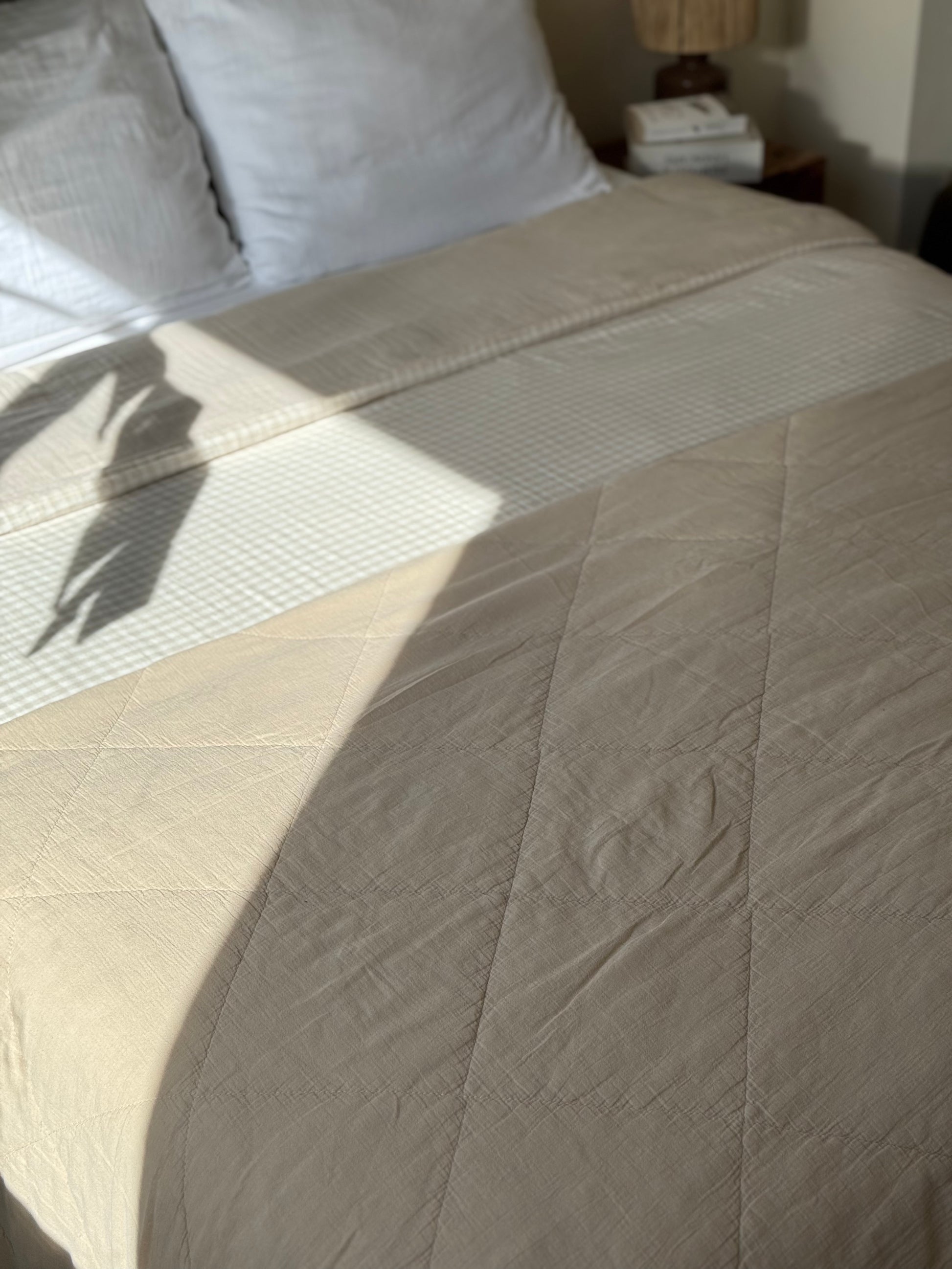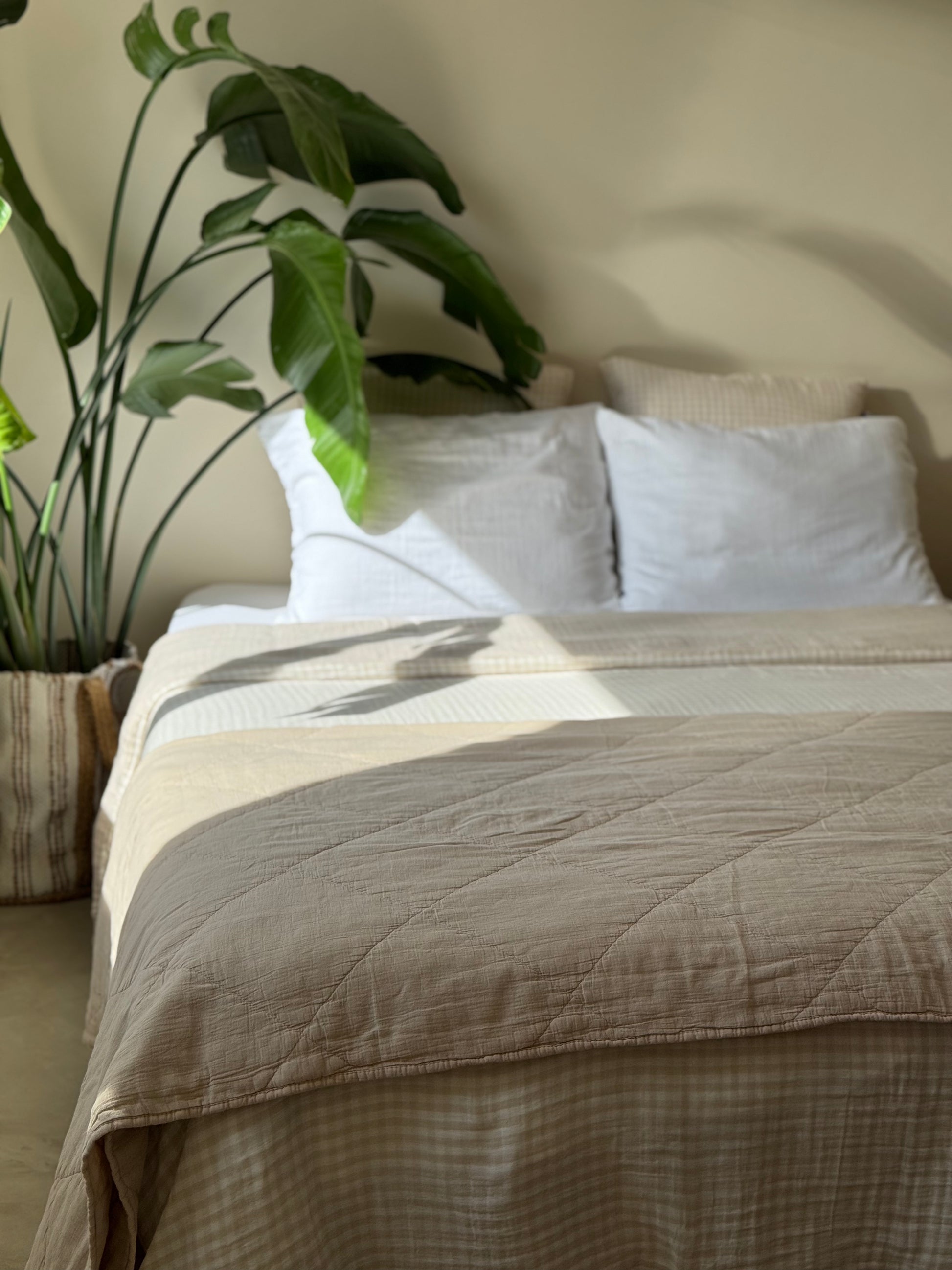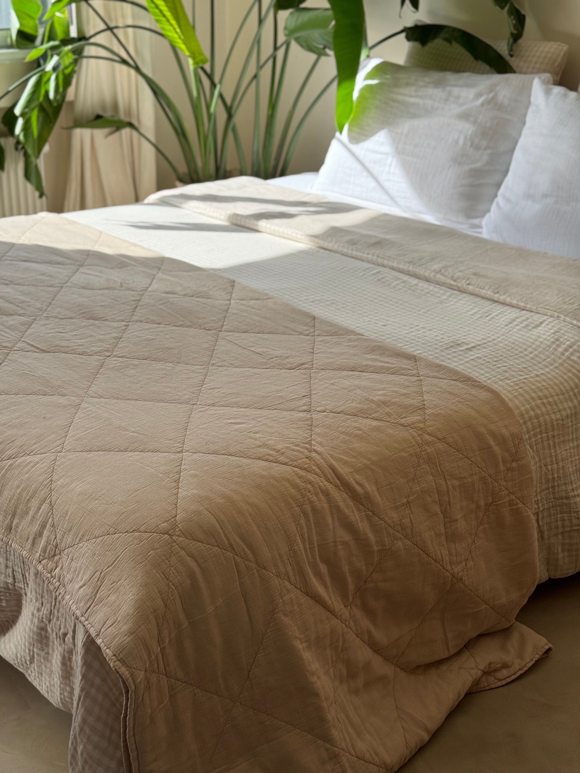 Jeté / plaid en gaze de coton matelassé beige. Sa taille le rend polyvalent, il peut-être utilisé en plaid pour le canapé, ou en jeté sur le lit pour une décoration bien finie. Cette matière ne se repasse pas vous n'aurez donc pas cette "corvée" à accomplir pour rendre votre intérieur stylé ;)