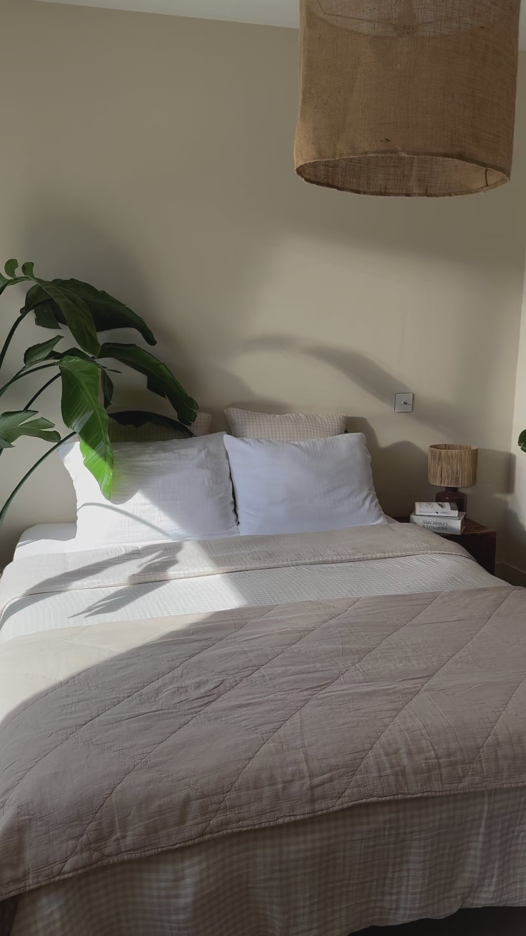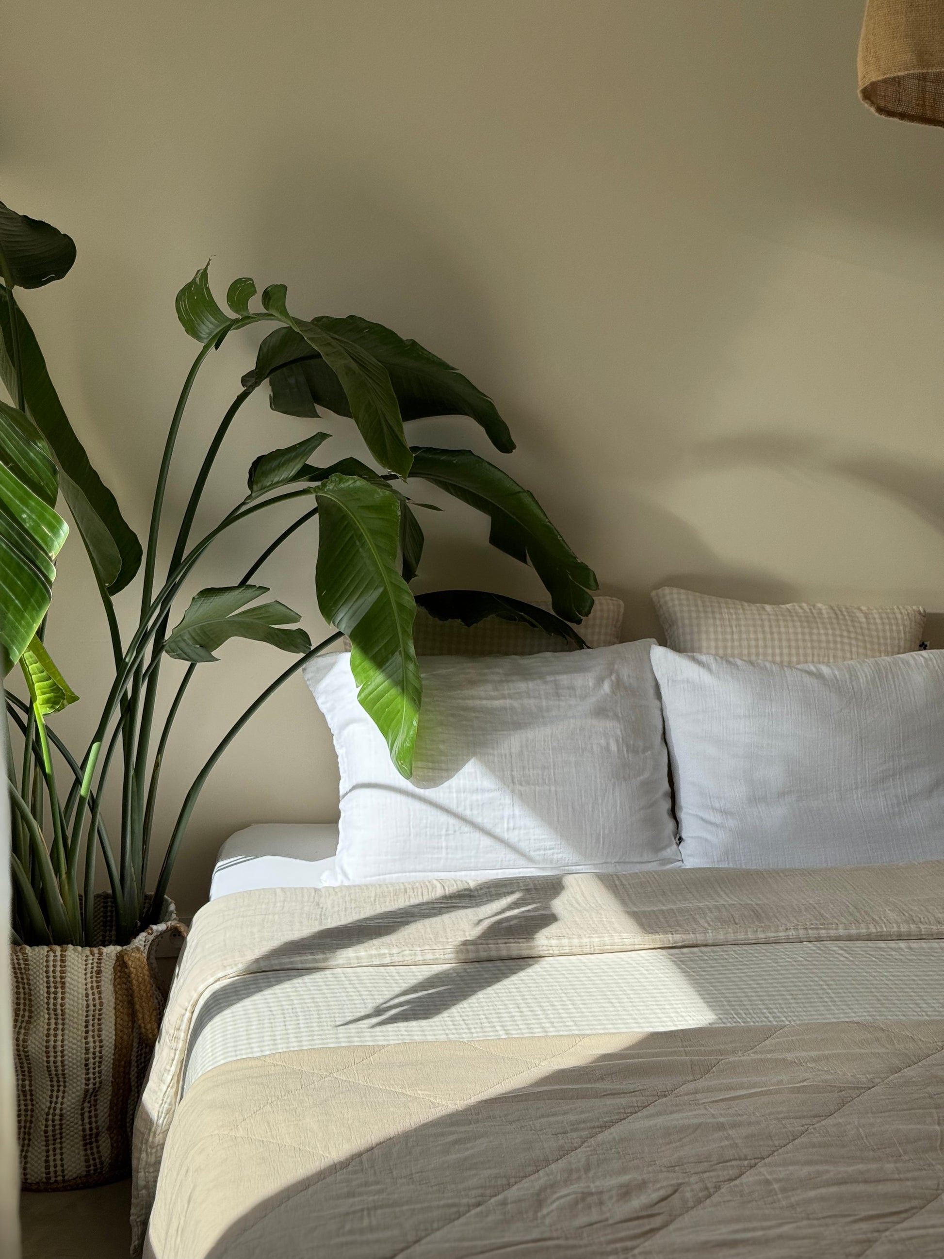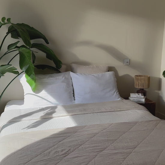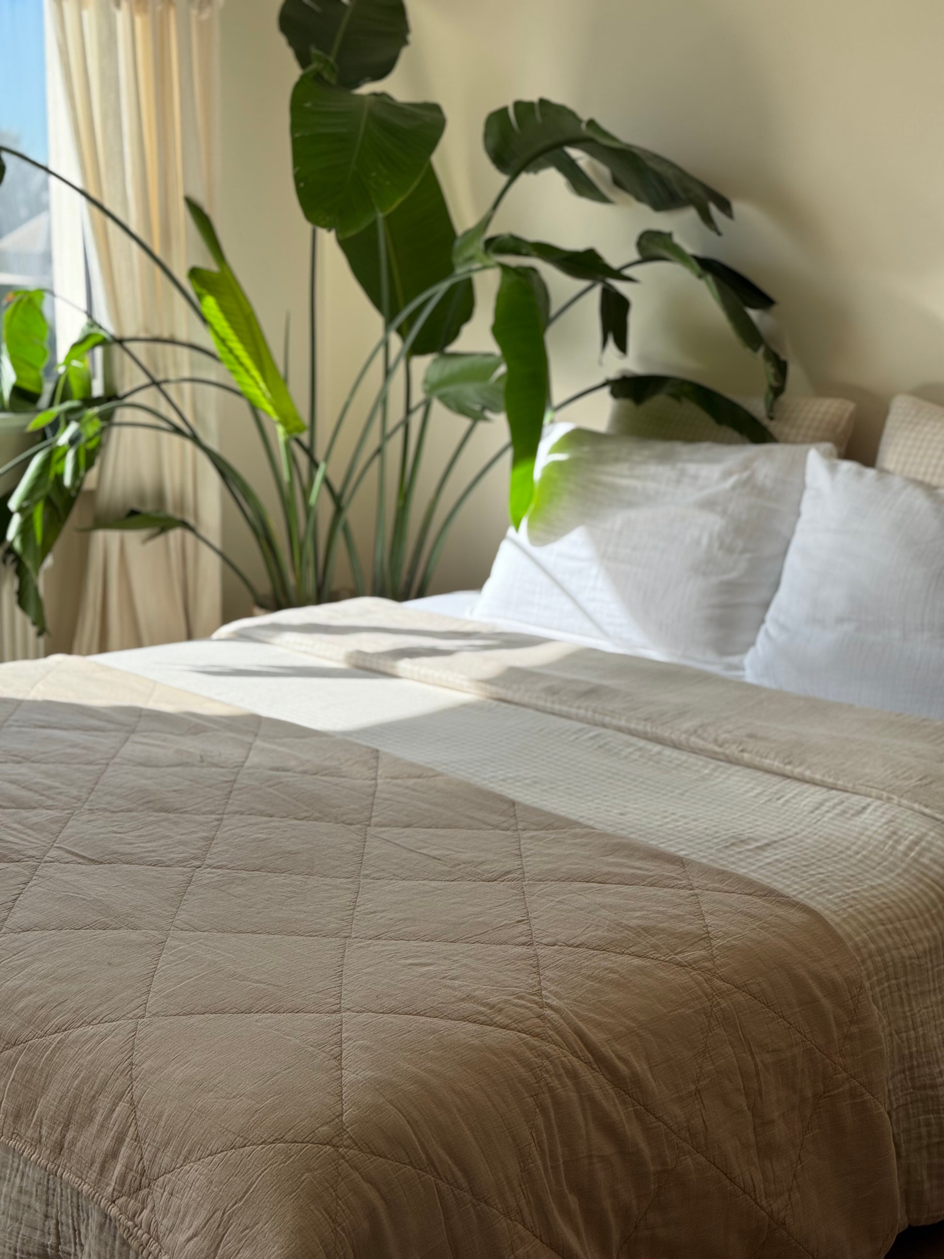 Jeté / plaid en gaze de coton matelassé beige. Sa taille le rend polyvalent, il peut-être utilisé en plaid pour le canapé, ou en jeté sur le lit pour une décoration bien finie. Cette matière ne se repasse pas vous n'aurez donc pas cette "corvée" à accomplir pour rendre votre intérieur stylé ;)