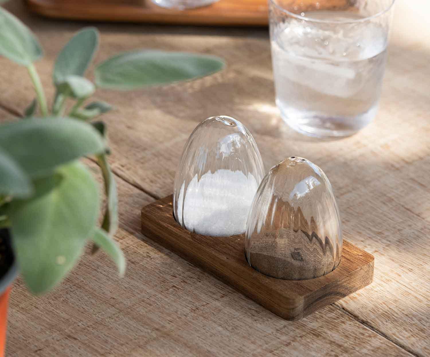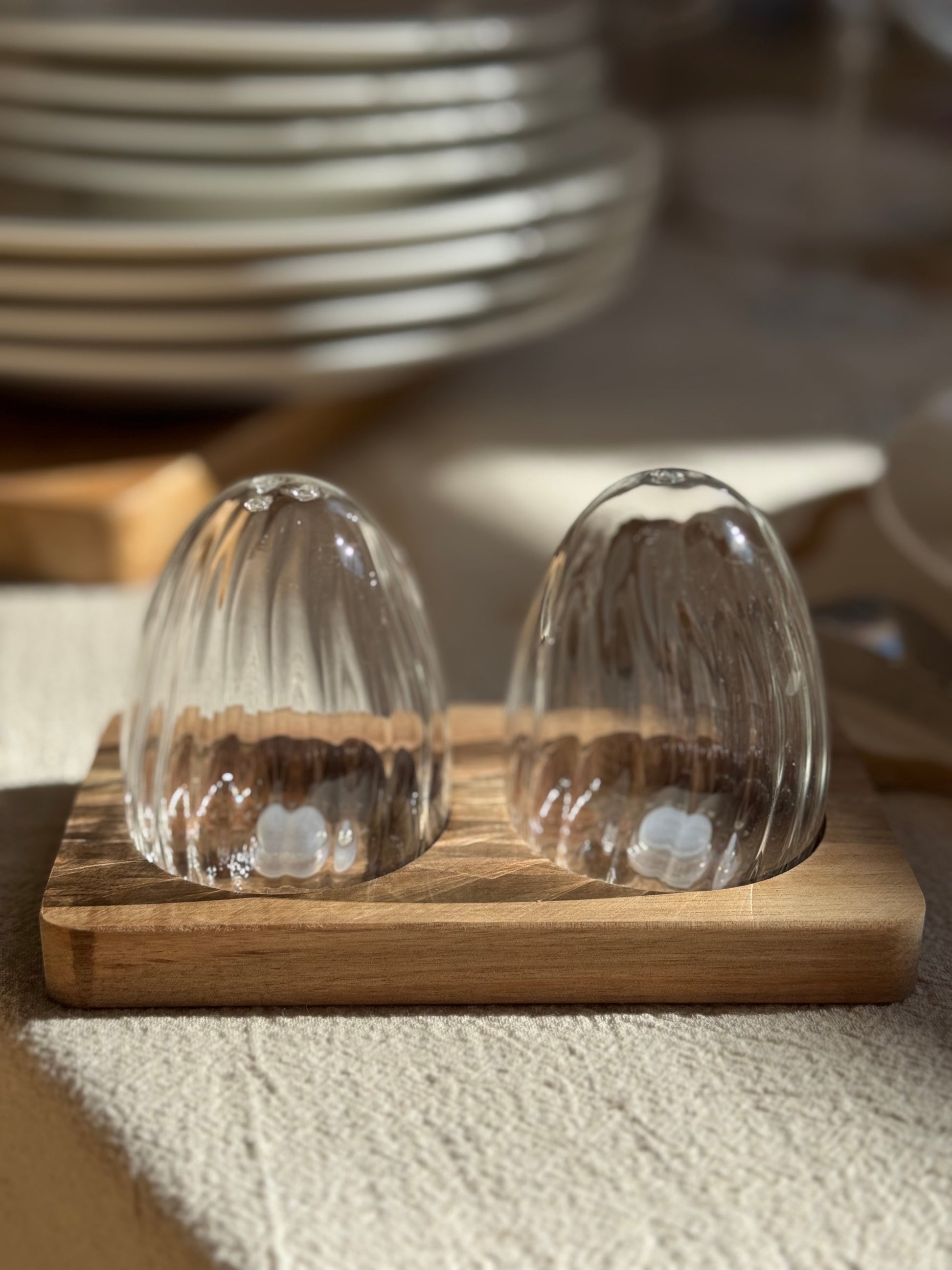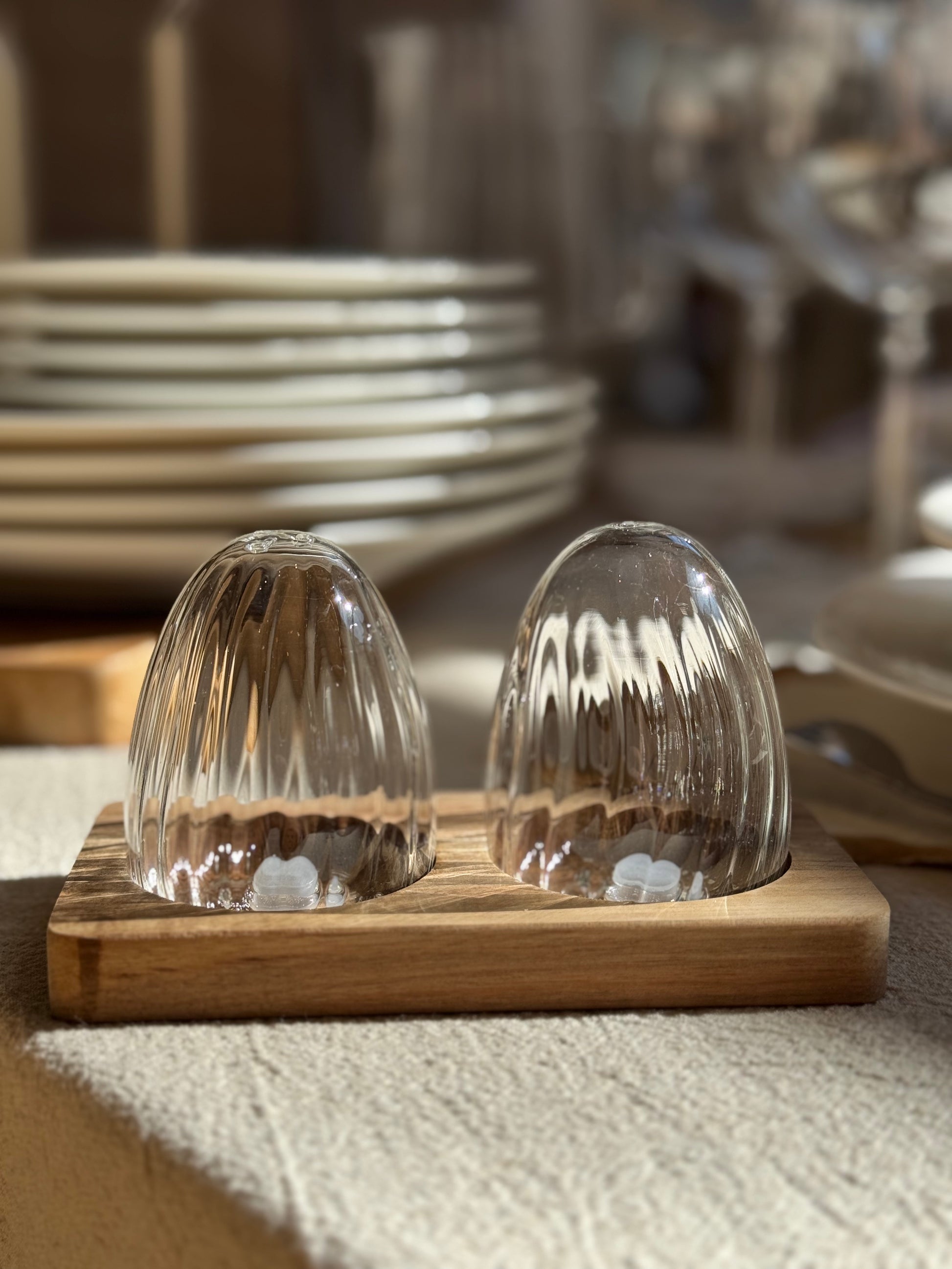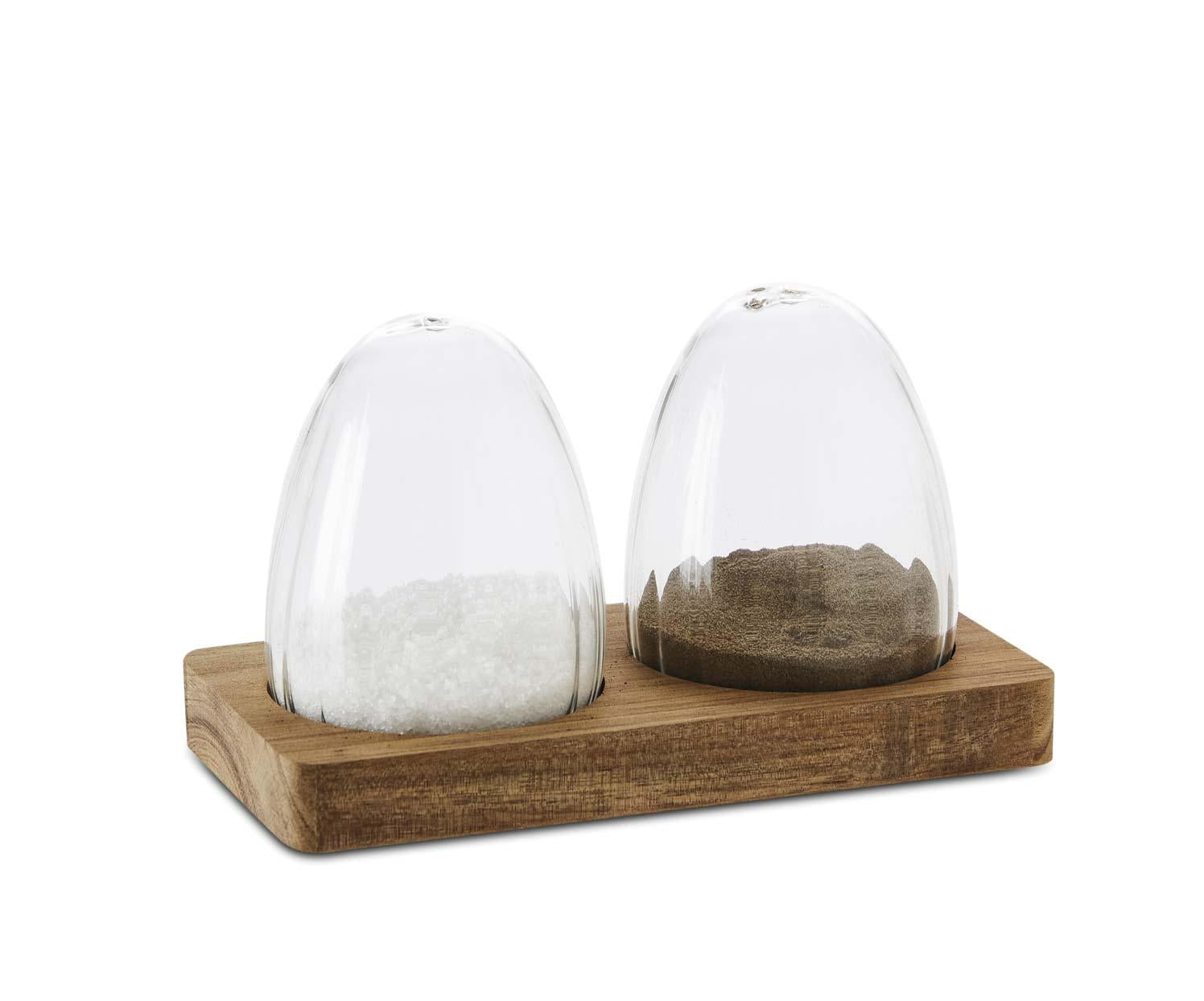 Salière et poivrière striées de forme ovale, avec son socle en bois d'acacia. Se remplissent par le dessous du contenant.