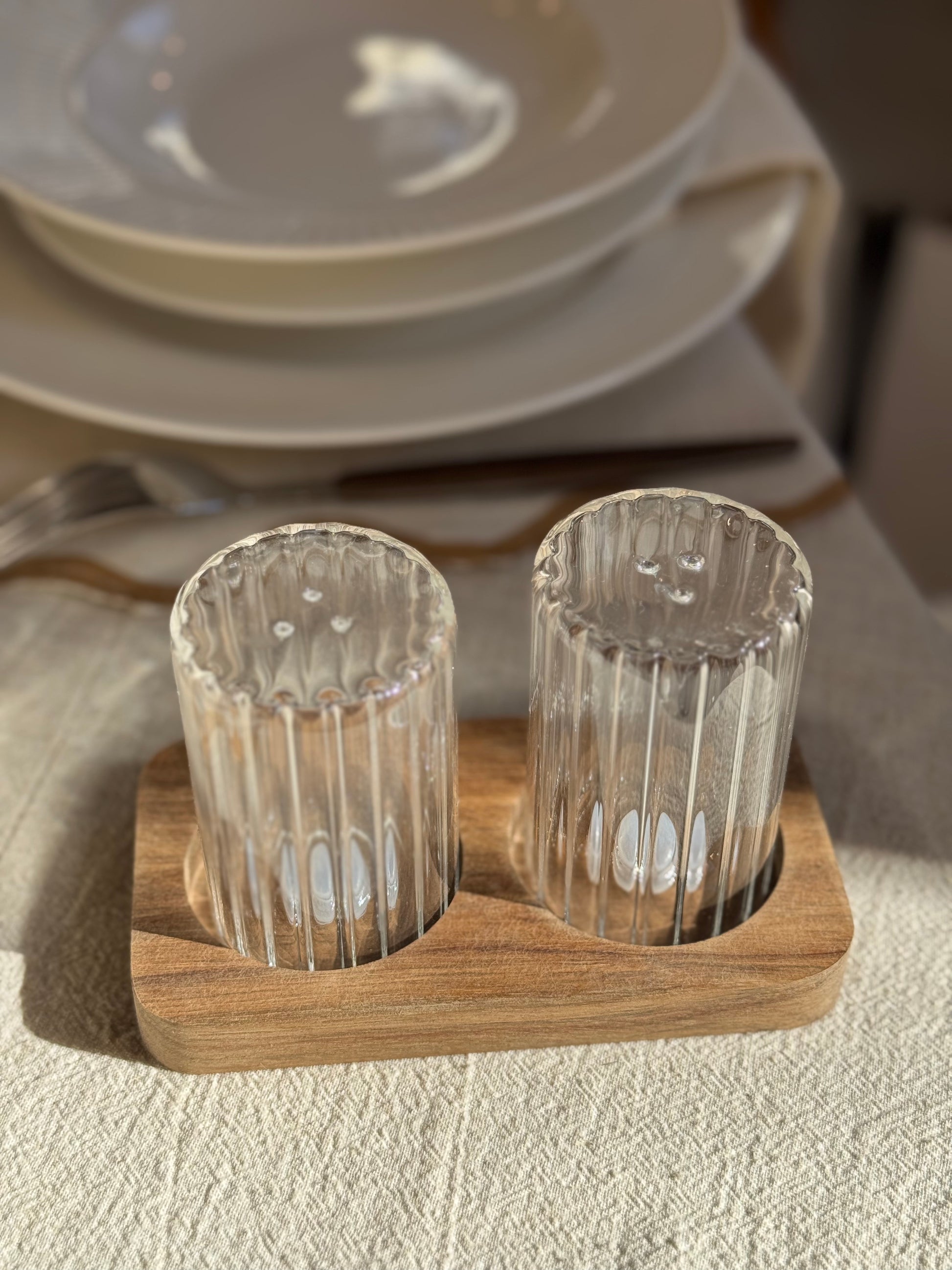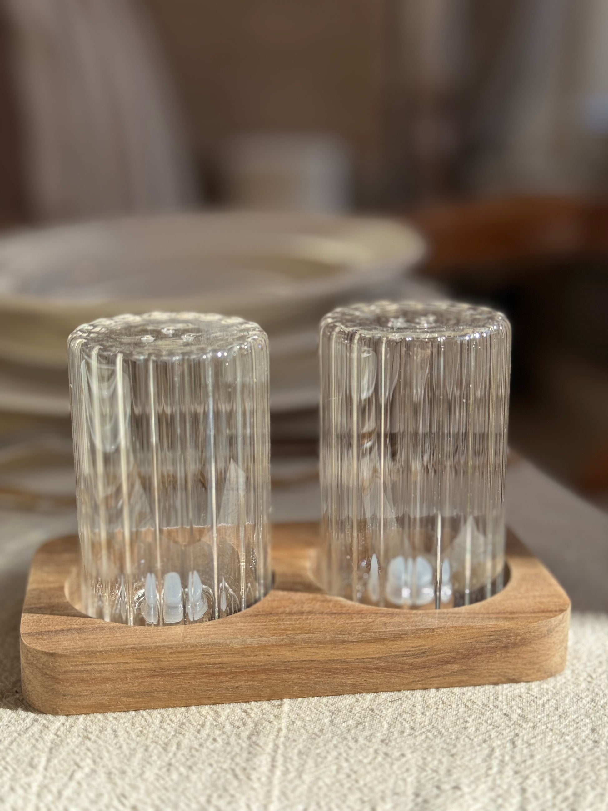 Salière et poivrière en verre strié, avec socle en bois d'acacia. Se remplissent par l'arrière du contenant.