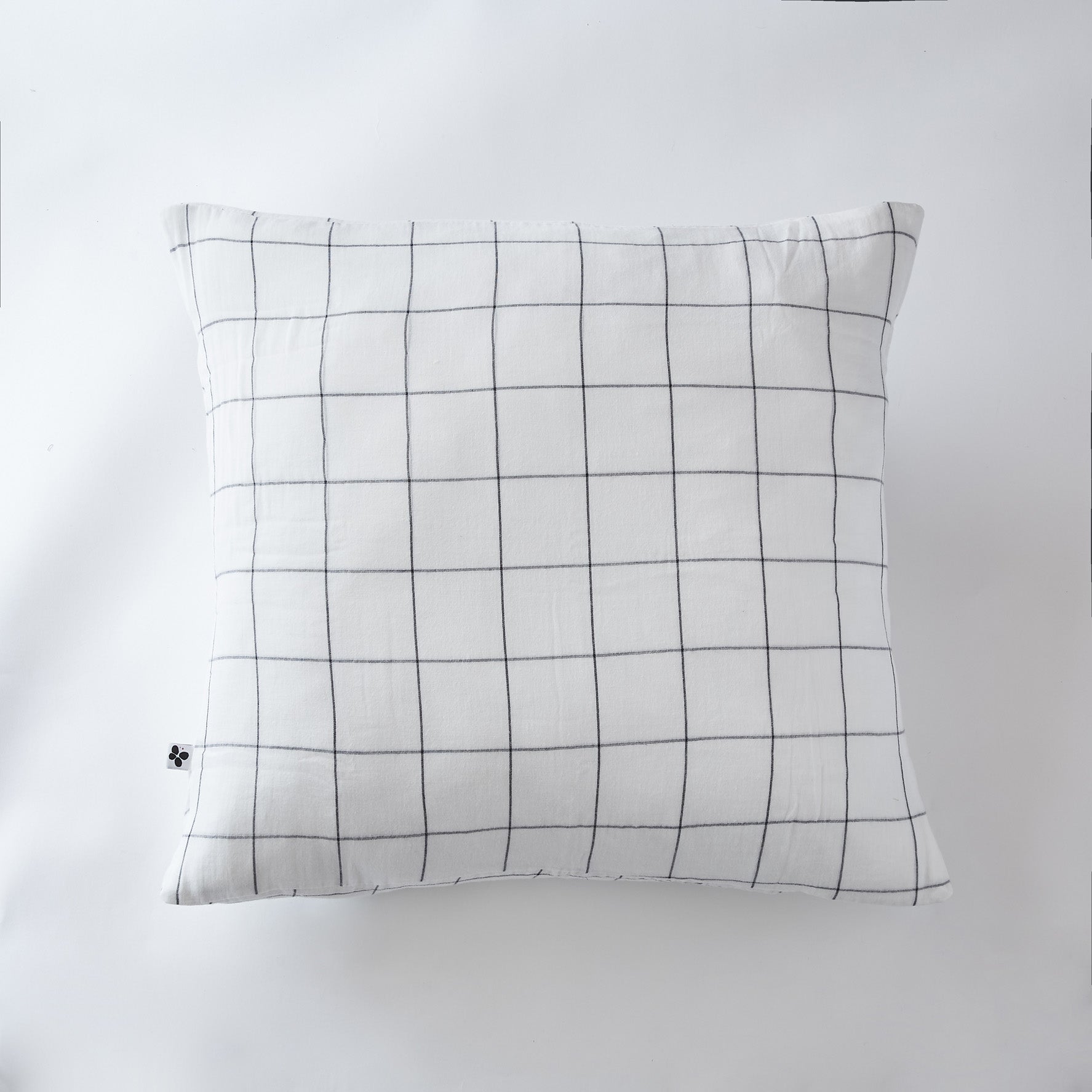 Taie d'oreiller blanche à grands carreaux, en gaze de coton. Ouverture portefeuille avec rabas. La gaze de coton gagne en souplesse et douceur au poil et sur mesure des lavages.