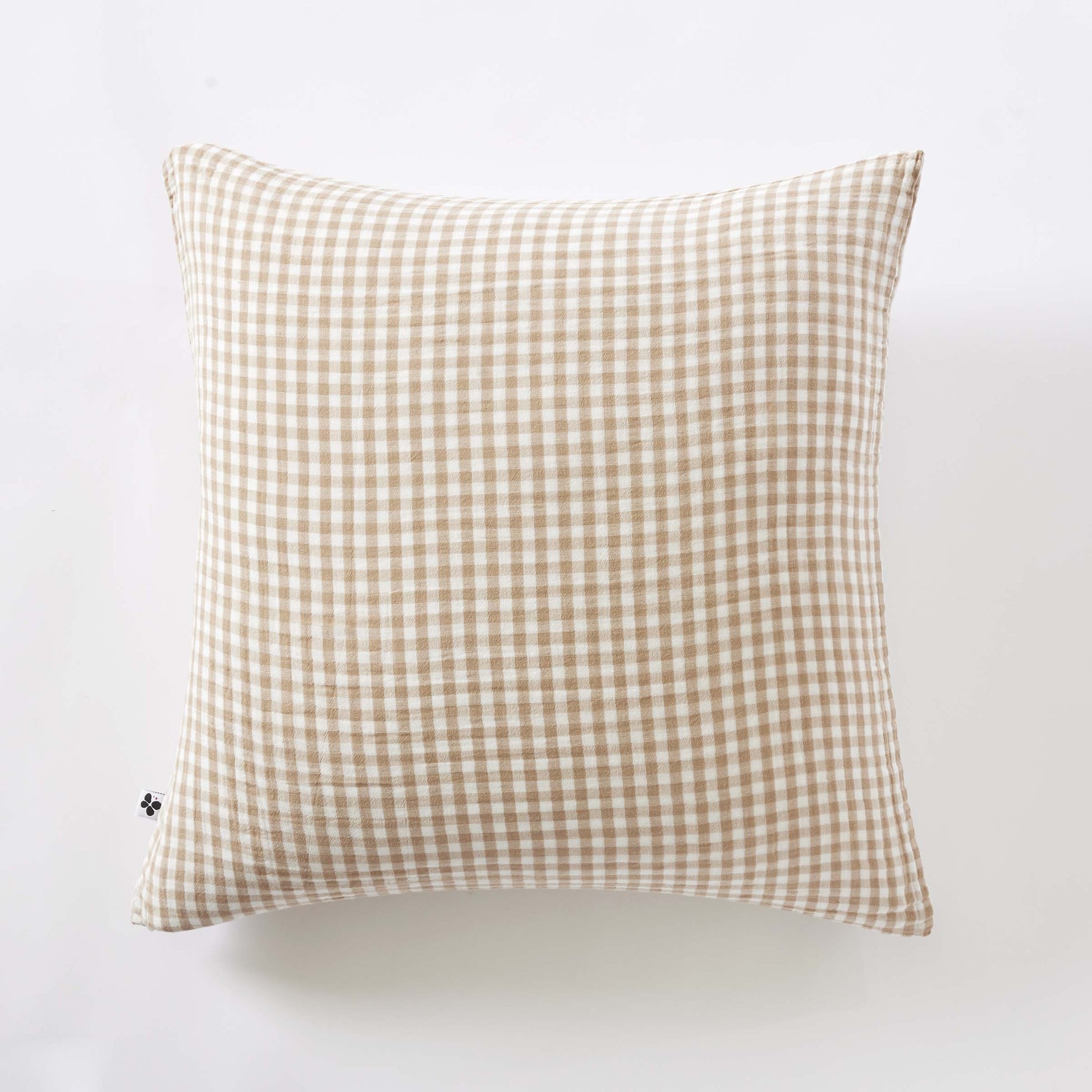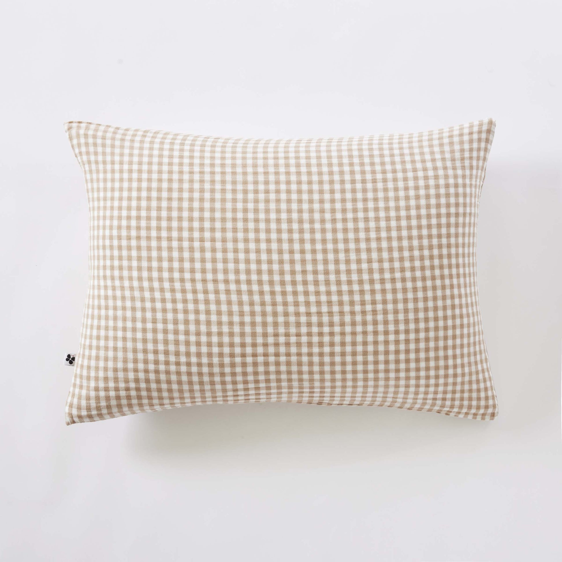 Taie d'oreiller en gaze de coton tissé, vichy ficelle et blanc. Ouverture portefeuille avec rabas.